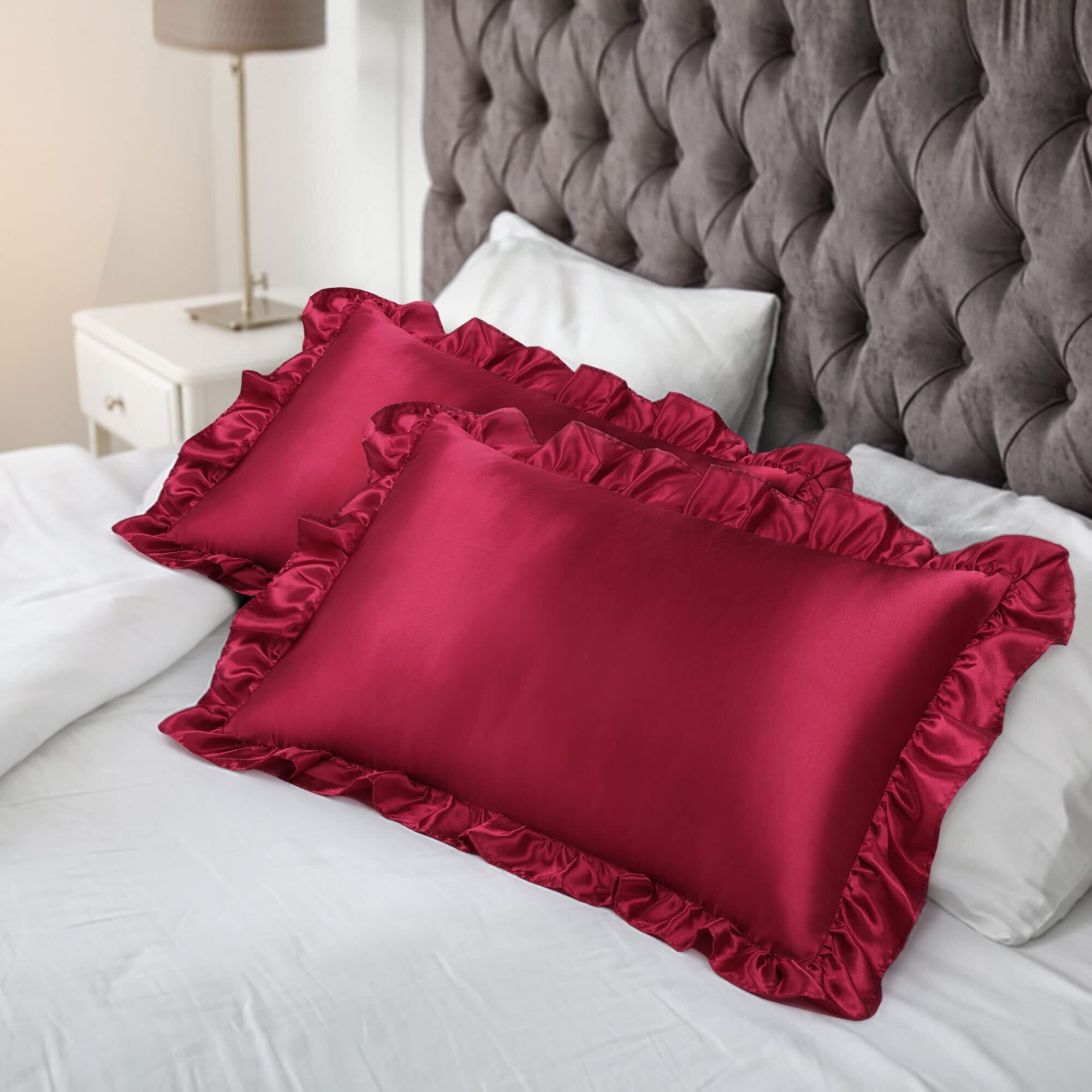 【数量限定】PiccoCasa 枕カバー サテン フリル ひんやり レーヨン 封筒式 接触冷感 ピローケース 2枚 セット シルクみたい柔らかい 両面枕カバー 無地 防臭 美髪 美肌 ブルゴーニュ 50 x 75cm | わくわくSHOP