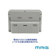 機能:電波受信機能(自動受信、手動受信)、電波受信状況表示、カレンダー表示、温度表示、湿度表示、12/24時間表示切替、電子音アラーム、スヌーズ機能、バックライト (残照機能付き)