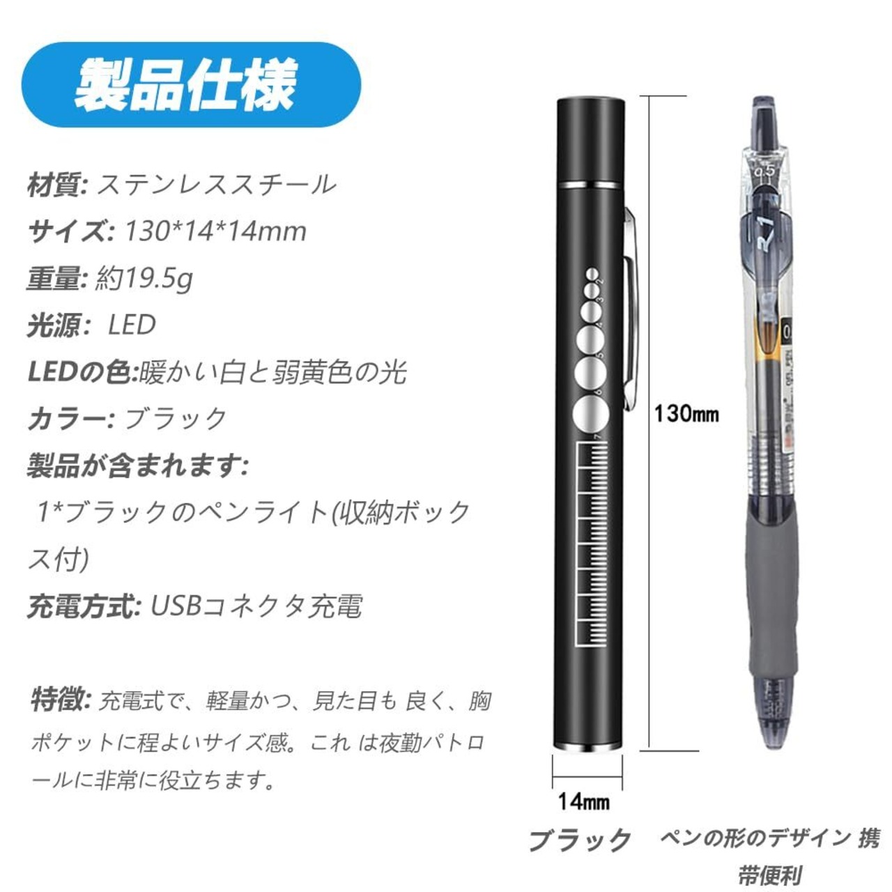 【小型・超軽量】高品質のステンレススチールを用いられた本体は、130*14*14 mmのコンパクトサイズで、片手で簡単に操作できます。非常に便利なミニサイズで、アウトドア、日常の照明、夜間のミニ懐中電灯としてもお使いいただけます。充電式なので、電池式より軽いです。ペンライトは19.5 gと業界的に非常に軽いタイプです。