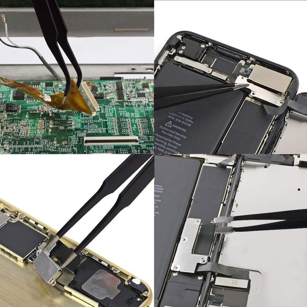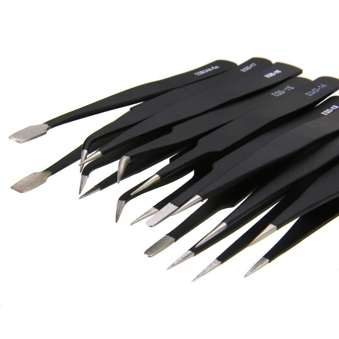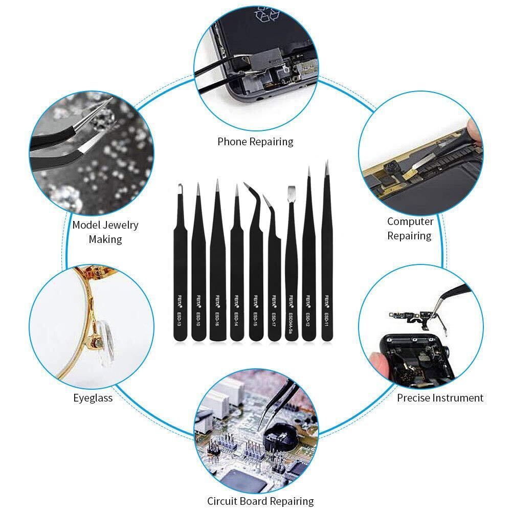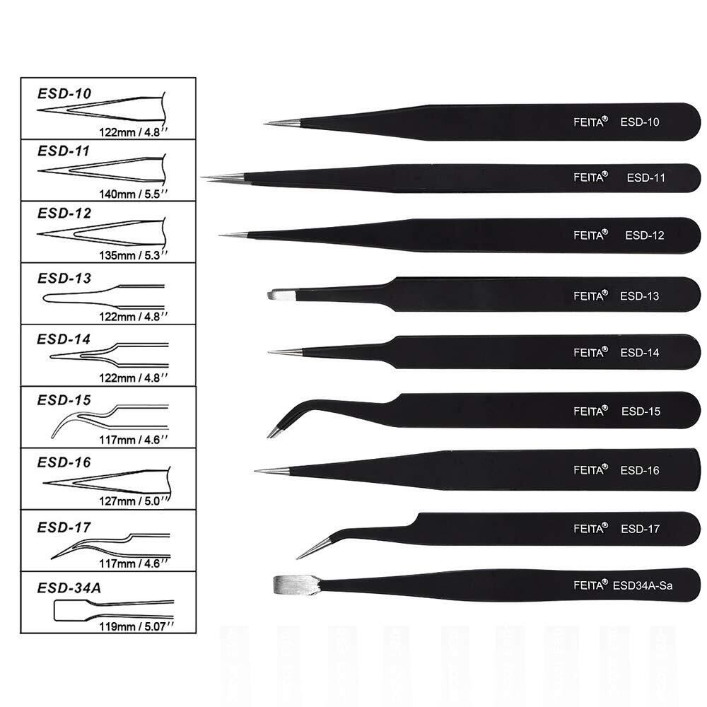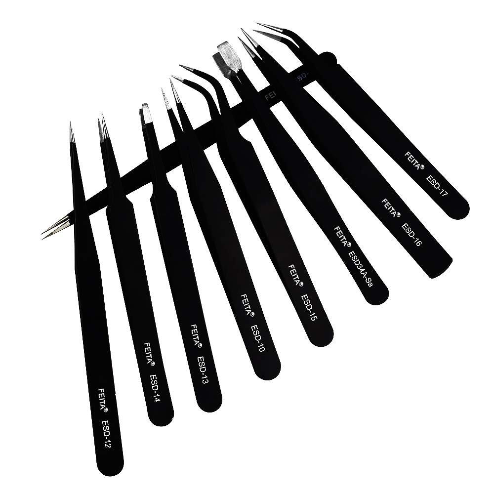 精密ピンセット キット | FEITA プロフェッショナル テンレス鋼帯電防止ピンセット、電子機器、工芸品、宝石、時計職人、趣味用(黒9個)