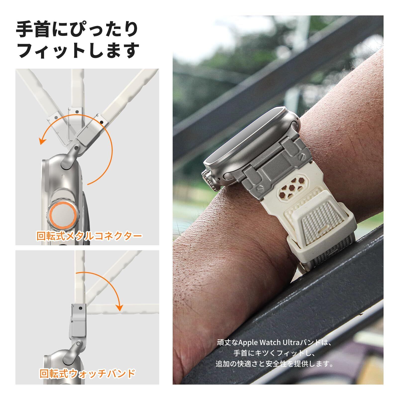 手首にぴったりフィット:回転式コネクターと時計バンドは、柔軟性と調節性が高いため、手首にぴったりフィットします。頑丈なApple watchウルトラバンドは、手首にぴったりとフィットし、快適さと安全性を高めます。