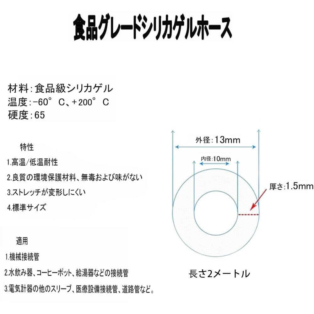 【サイズ】製品名 : シリコンチューブ 。内径:10mm 、外径:13mm 、壁厚さ:1.5mm 。長さ:2m 。