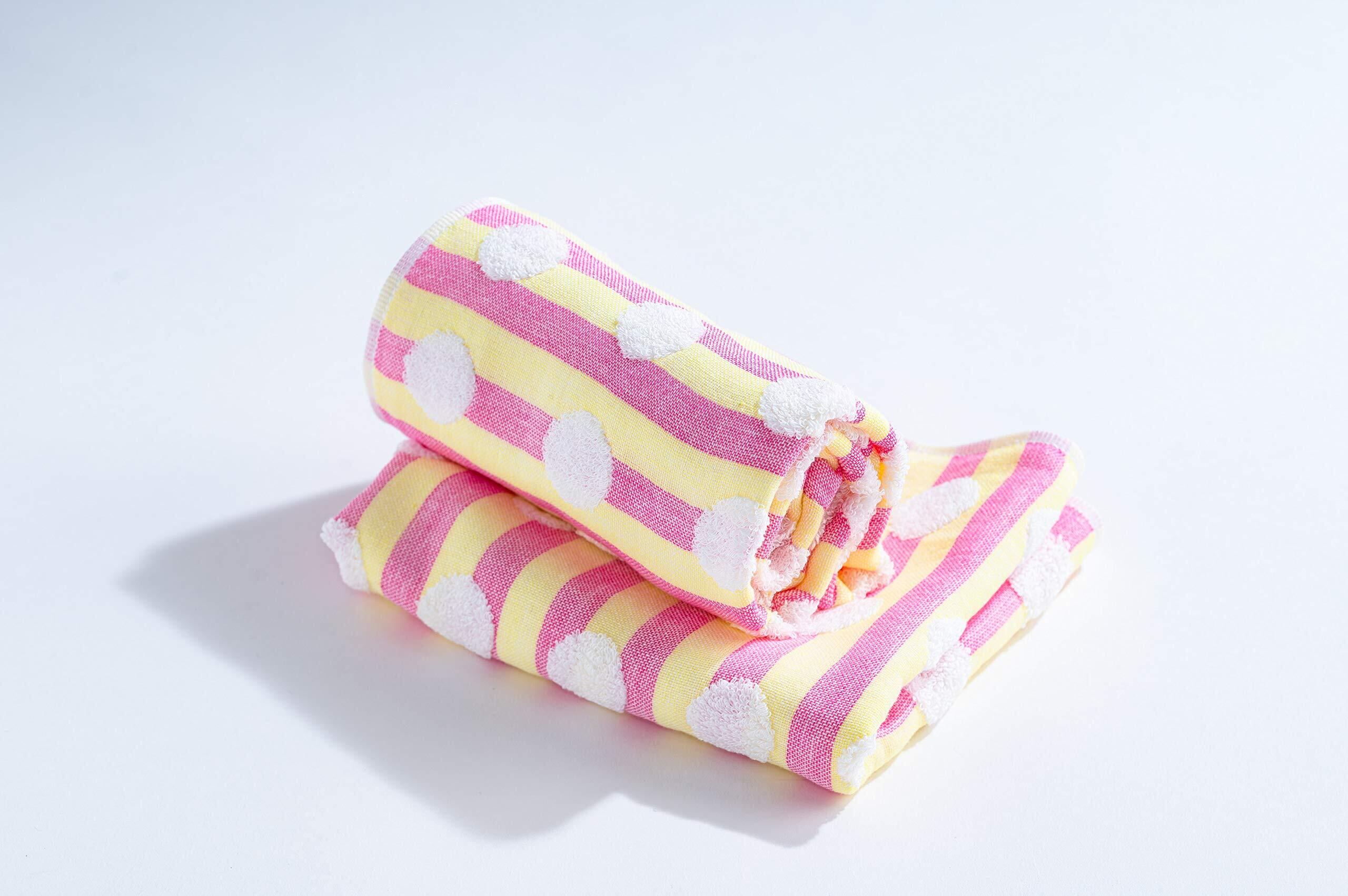 表面はガーゼ織り、裏面がパイル織りになっています。ドット部分のパイルが浮き出ており可愛らしいアクセントになっています。