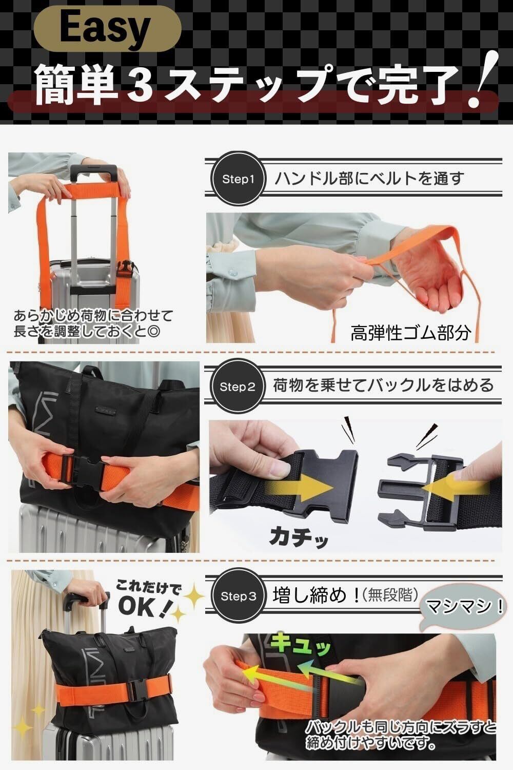 【数量限定】VERTRAUEN スーツケースベルト 旅行便利グッズ バッグとめるベルト 荷締め用 目印 (ブラック, Mサイズ(最大150cm))