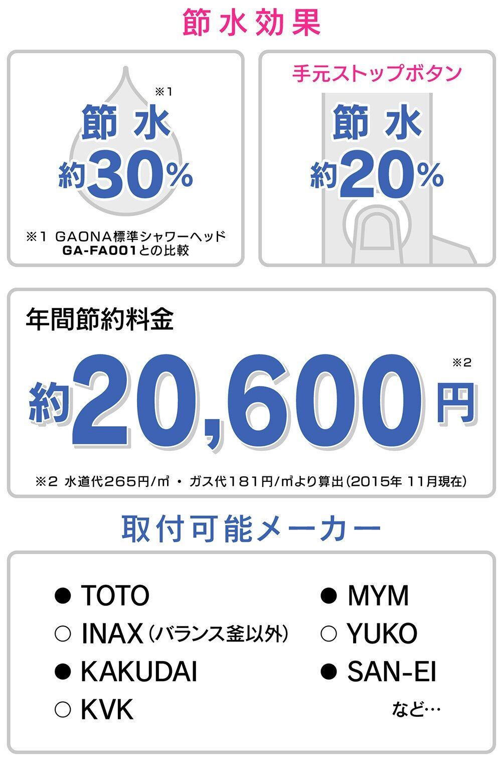 従来型シャワーヘッドと比べて約30%の節水効果(ガオナ比)、毎日の生活で意識せずに節水可能。
