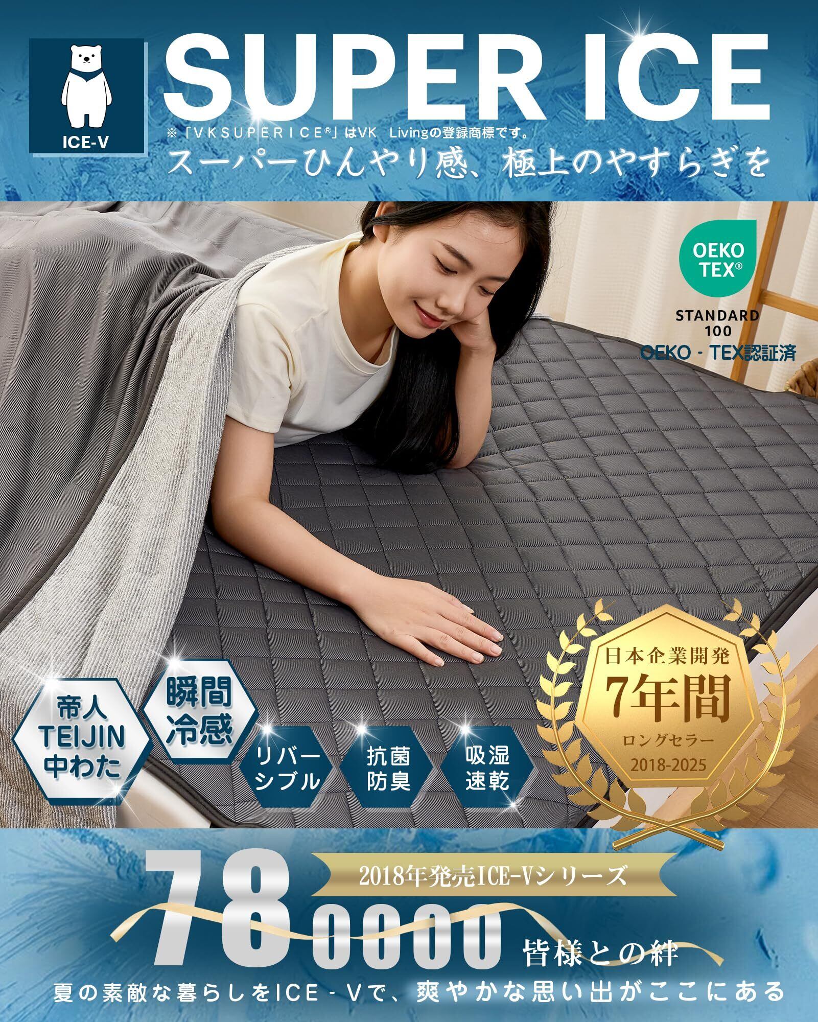 【進化を続ける「ICE-Vシリーズ」7周年記念!】人気のICE-Vシリーズ、今年で7周年!5年連続敷きパッド第1位、掛け布団第1位、タオルケット第1位、3冠達成!合計78萬枚突破!大変多くのご注文をいただき、本当にありがとうございます。OEKOTEX認証済、ISO9001認定工場、Transparencyによる確認済、最高の眠りを提供します!「ICE-Vシリーズ」は、これからも進化し続けます。