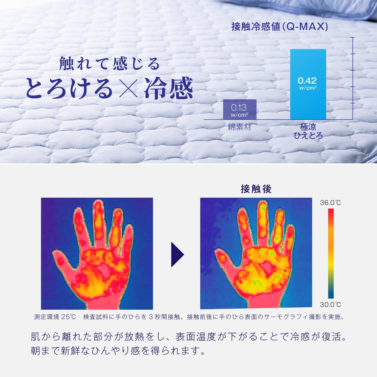 【冷感×吸湿放湿×抗菌防臭×防ダニ】夏を乗り切るひえとろ冷感敷きパッド 触れた瞬間、スーッと冷たい。暑い夜でも気持ちよく眠れる夏専用の冷感寝具。Tobestの 「ひえとろ 冷感敷きパッド」は、第三者機関で冷感性能が証明された冷感生地(Q-MAX0.42)を採用し、寝苦しい夜に心地よい“ひんやり感”を届けます。 さらに吸湿・放湿機能付きの高機能わたを使用しているため、蒸し暑い梅雨や真夏でもムレにくく快適。抗菌・防臭・防ダニ機能も備えた、夏の寝具として理想的な1枚です。
