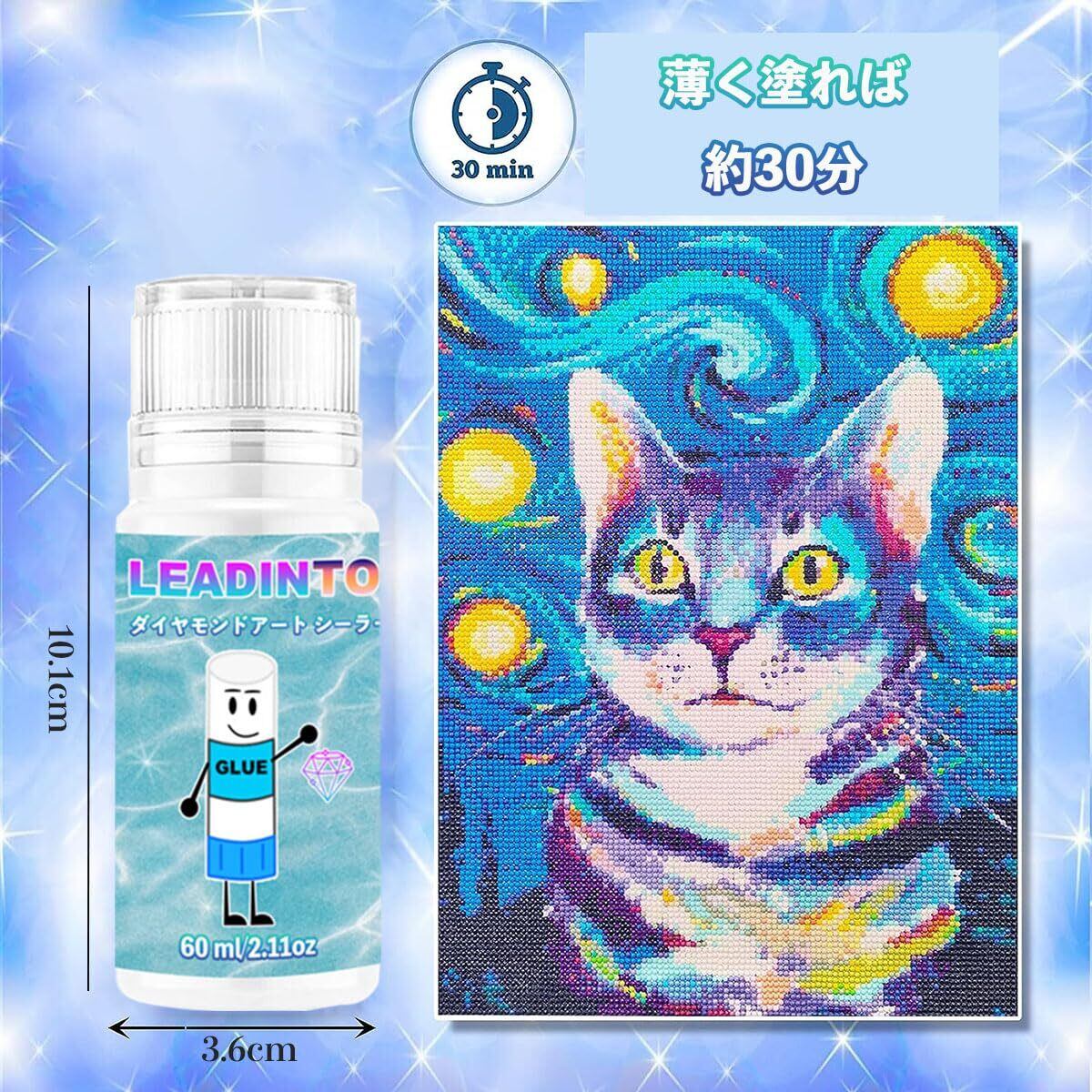 【輝きを永久に保ちます】LEADINTOP ダイヤモンドアートシーラーは完成したダイヤモンドペインティングを永久的に、きれいで光沢のある仕上がりに保つのに適しています。時間の経過とともに輝きが失われる心配はありません。60mlシーラーは約1枚30×40cmのダイヤモンドアートを作ることができる。