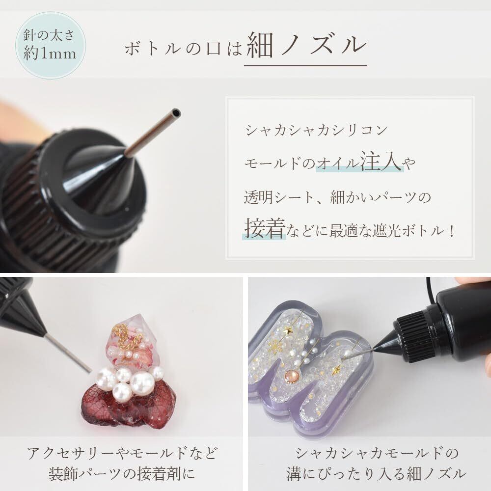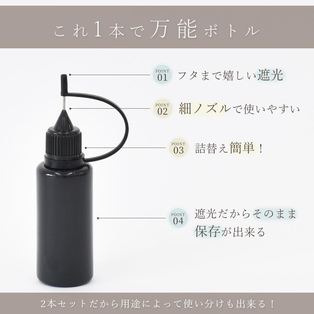 容器が2本あるので、シャカシャカレジンの中に入れるオイルや作品の装飾パーツを接着するレジンを入れたりと色々な用途に合わせて使い分けが出来ます。 光を通しにくい黒いボトルだから詰め替えも安心です。