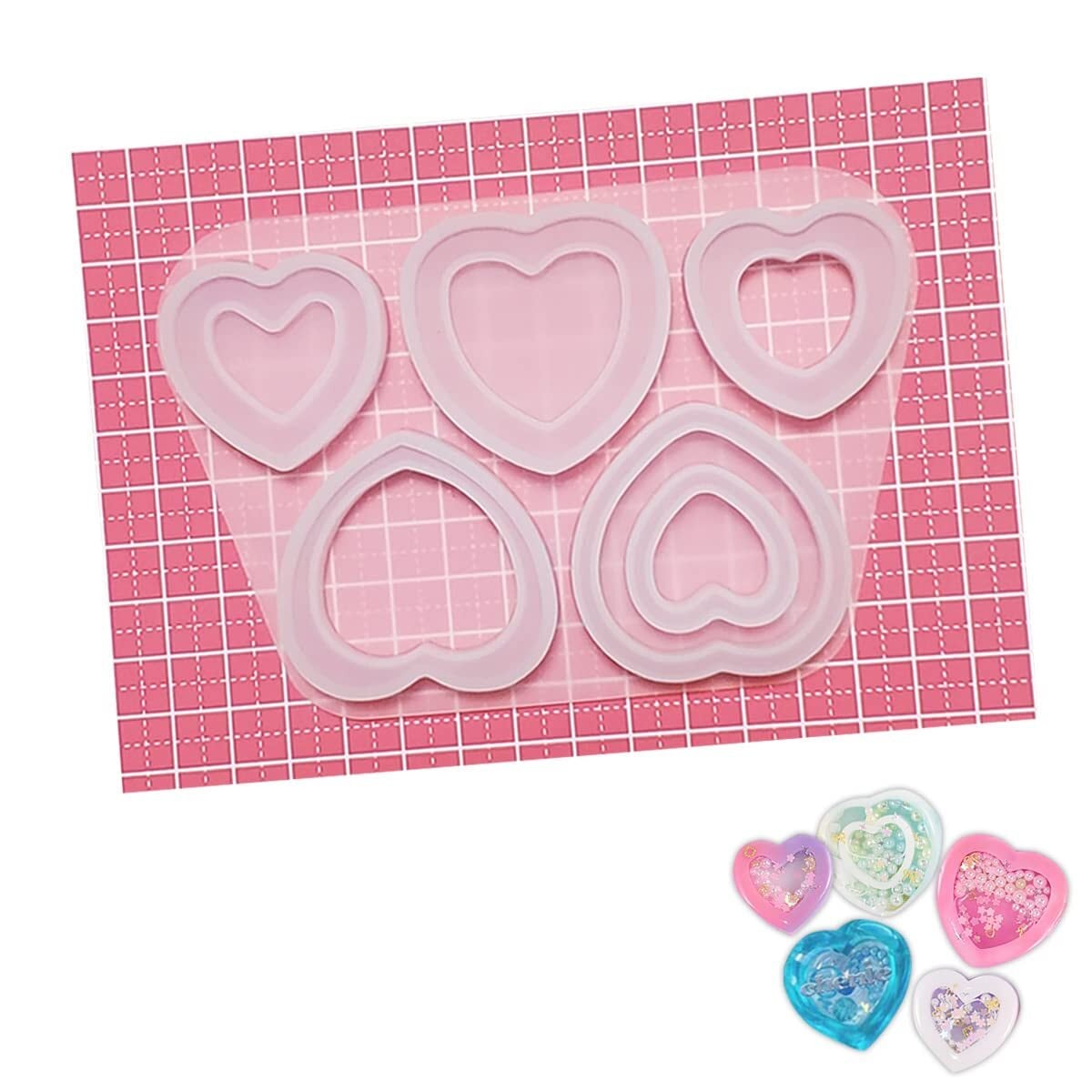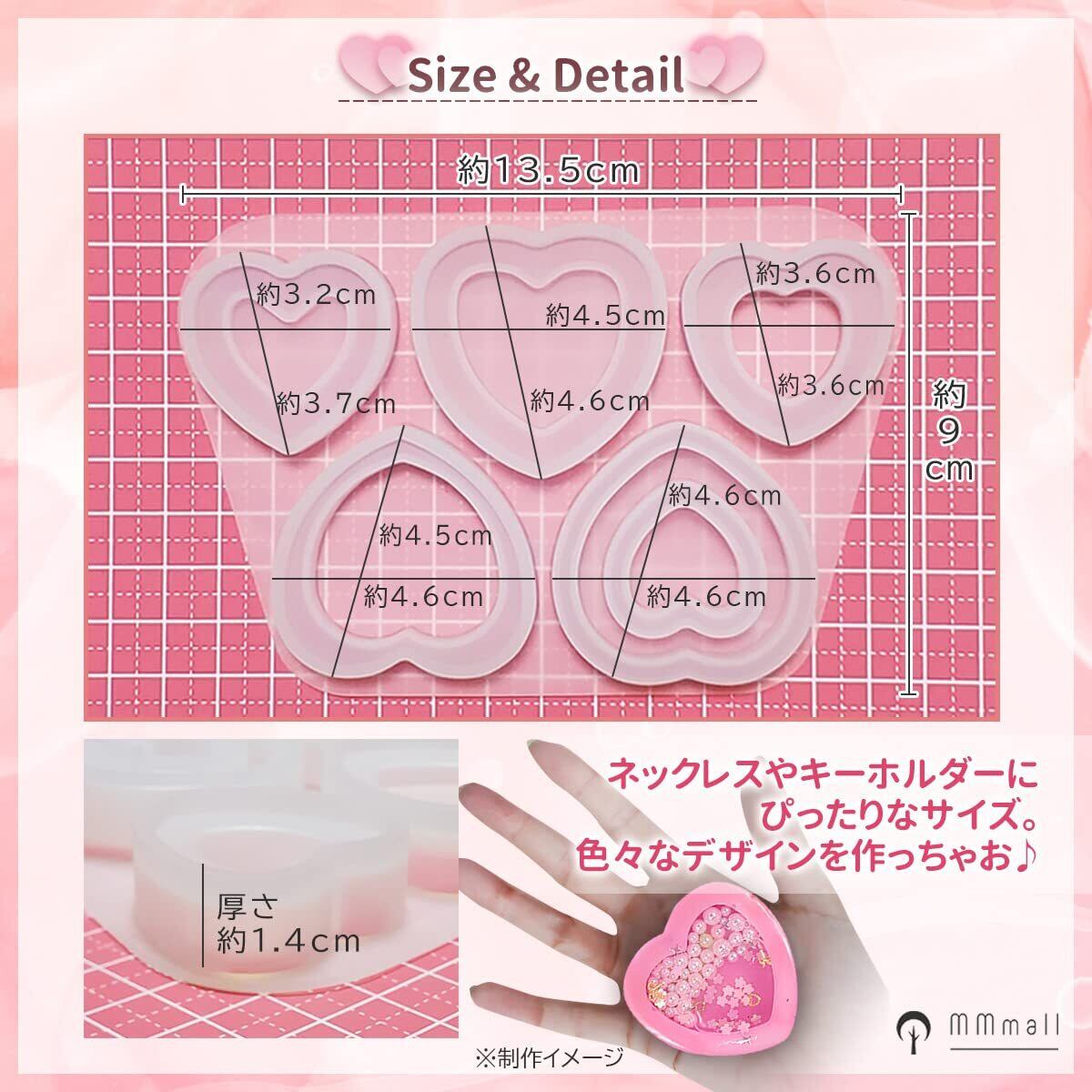 【5つの異なるハートシェイカーが作れる!!】大小の可愛いハート型が5つセットになったモールドプレートが登場!一度に5パターンのハートが作れます高品質シリコンモールド。アクセサリー、ハンドメイド、キーホルダー、トレカケース、ストラップなどオリジナルアクセサリーの材料に最適です。