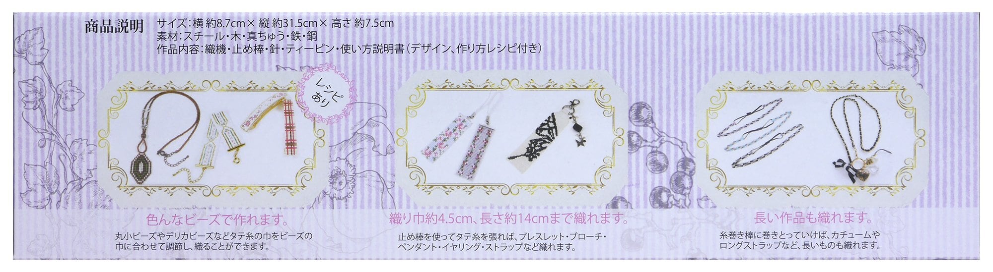 止め棒を使ってタテ糸を張れば、織り巾約4.5cmまで、長さ約14cmまで織れるため、ブレスレット、ペンダント、イヤリング、ストラップなど様々な作品ができます。