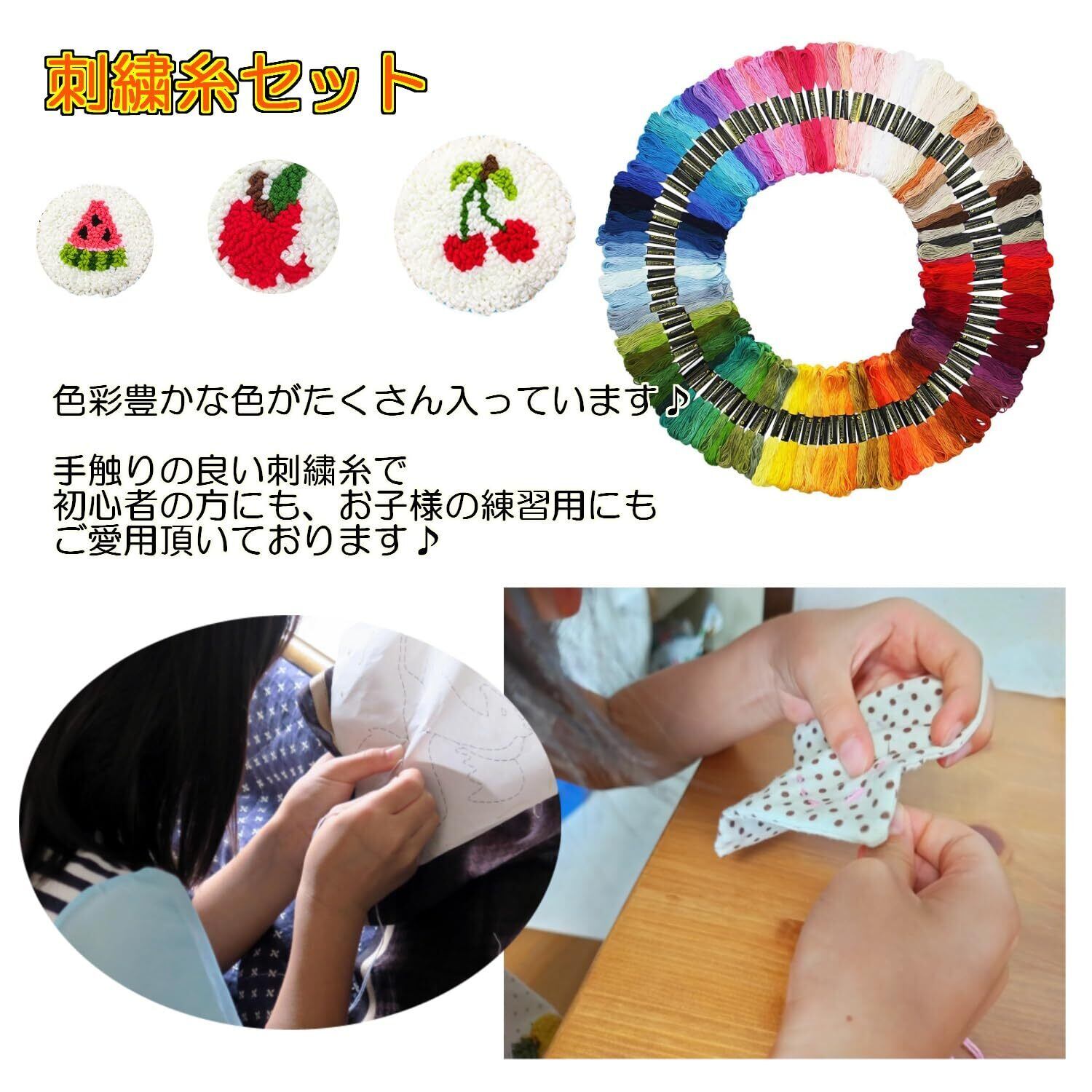 【素材】刺しゅう糸は高品質な100%ポリエステル綿で作られおり、毛羽立ちにくく、カラフルで独特の光沢感があり、純綿に比べて手触りが滑らかです。洗っても色落ちしにくく、耐久性が抜群です。