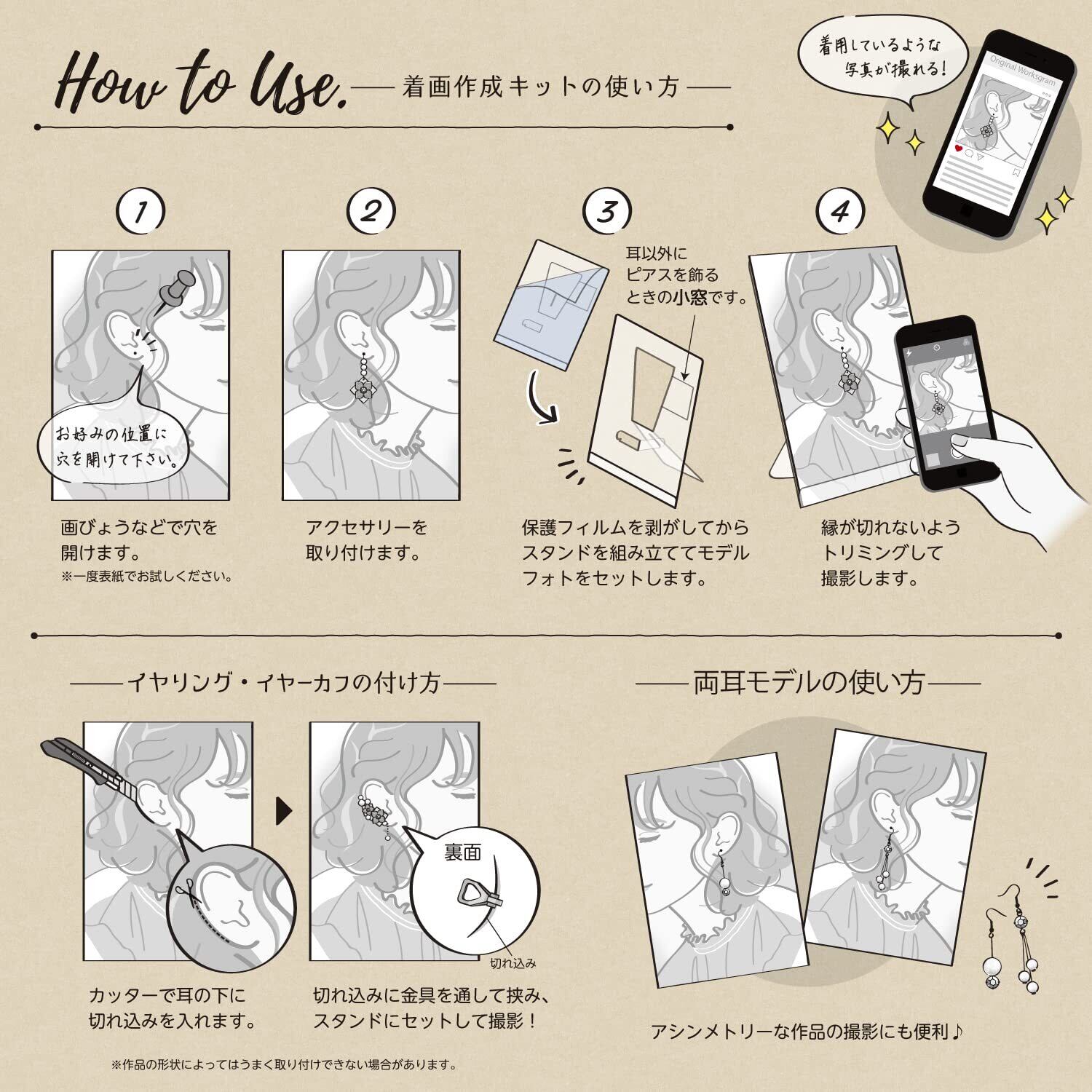 【着画作成キット ピアス(両耳)モデルフォト】 人気の着画作成キットに”両耳タイプ”が登場! モデルフォトを使えば、簡単手軽にピアスやイヤリングのフィッティング画像(着用画像)を自宅で撮影できます! アクセサリーのサイズ感が分かりやすく、「SNS映え」間違い無し <セット内容> ●モデルパターン:左向き4種類・右向き4種類 ※片面柄(印刷) ●フォトスタンド付き オススメポイント 1.A4サイズが置ける専用フォトスタンド付きで撮影しやすい角度にセッティング可能! 2.イヤリング・ピアス共に対応可能! 3.実際に作品を着用しないので衛生面でも安心! 4.全8種入りで1セットでたくさんのパターンを撮影できます 5.反射しづらい特殊紙なので、スマホ撮影も楽々 6.右向きと左向きのものがあり作品に合わせて左右を使い分けることができます。 7.A4サイズなので印刷も可能 <使用方法> ●ピアスの場合 1.お好みの位置に穴を開けます。画びょうなどで穴を開けてください。 2.保護フィルムを剥がしスタンドを組み立て、下のウケに着画を差し込みセットします。 3.縁が切れないようトリミングして撮影しましょう! ●イヤリング・イヤーカフの場合 1.カッターで耳の下に切れ込みを入れます。 2.切れ込みに金具を通して挟んでください。 ※無断でアクセサリー撮影以外の用途でお使いにならないでください。 複製しての再配布は禁止しております。