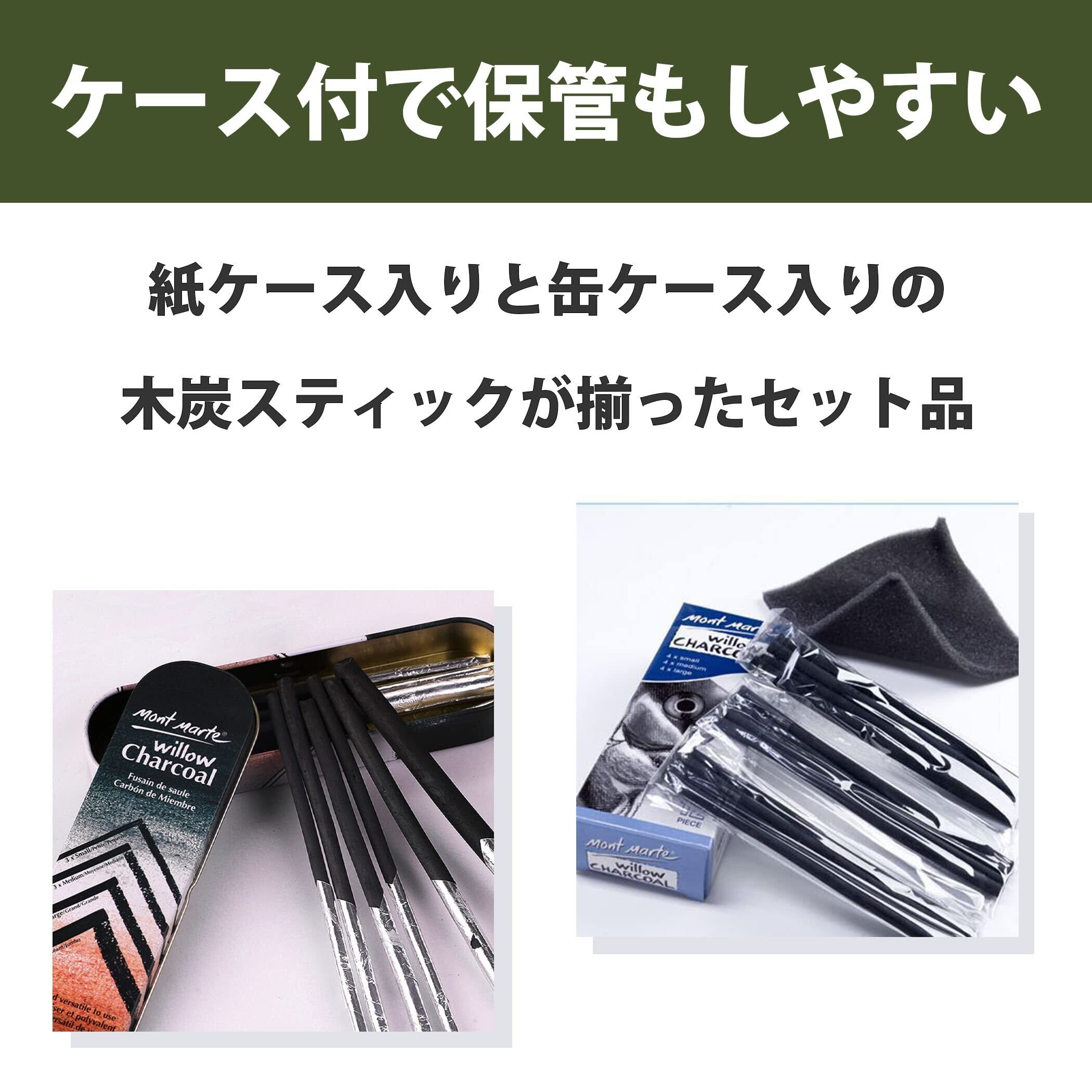 セット内容:缶ケース入り木炭スティック合計10本(種類と数量:約4.5mm×3本、約5.5mm×3本、約6.5mm×2本、約9mm×2本)、紙ケース入り木炭スティック合計12本(種類と数量:約4.5mm×4本、約5.5mm×4本、約6.5mm×4本) 素材:木炭 カラー:ブラック ※パッケージデザインに変更がある場合がございます。 ※モニターの環境等により、色の見え方に若干差が生じる場合がございます。