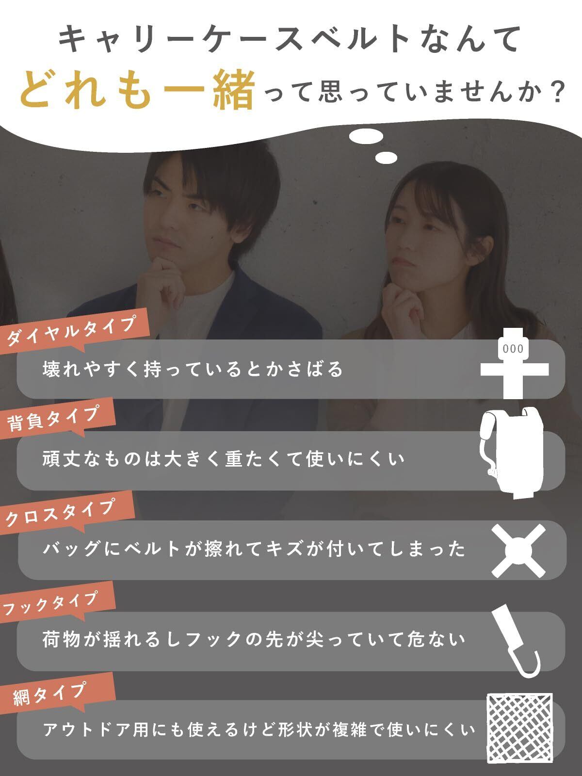 【利用シーン】トラベルバッグ・キャリーバックに荷物をとても簡単に固定することができます。 ほとんどのスライドハンドル付旅行用キャリーに使用可能な優れもの。出張 国内・海外旅行 電車 飛行機 移動時に キャスターバッグを持っていくときに役に立ちます。また、アウトドアの際にクーラーBOX上に荷物を載せた移動などでも活躍します!