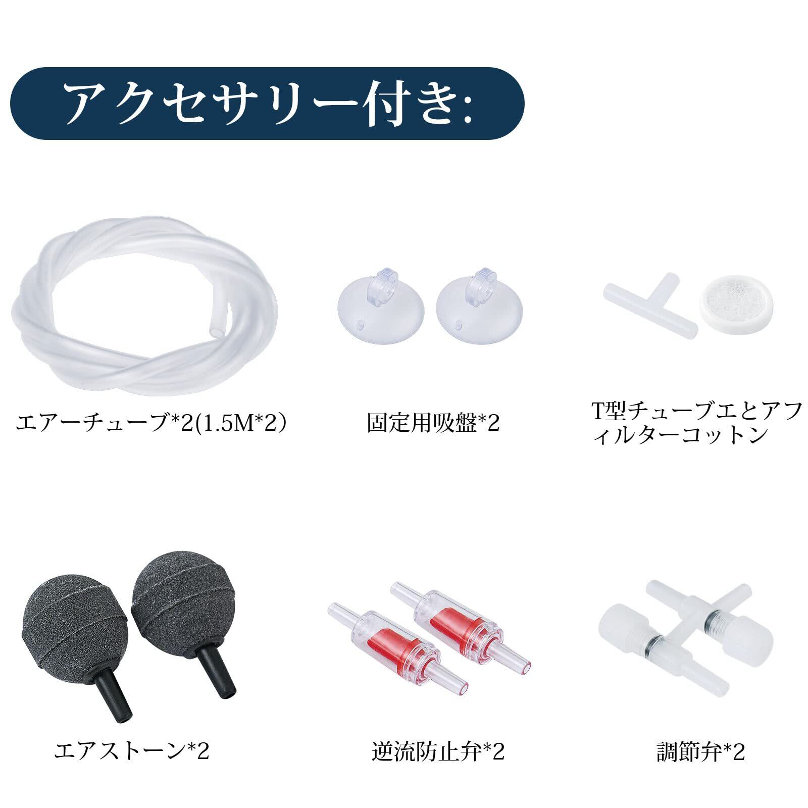 完備なアクセサリーが付き:1.5Mエアーチューブ *2、2つの逆流防止弁、2つのエアストーン、2つのエア量調節弁、1つのT型チューブ、1つのエアフィルターコットン、必要なものすべてがある。