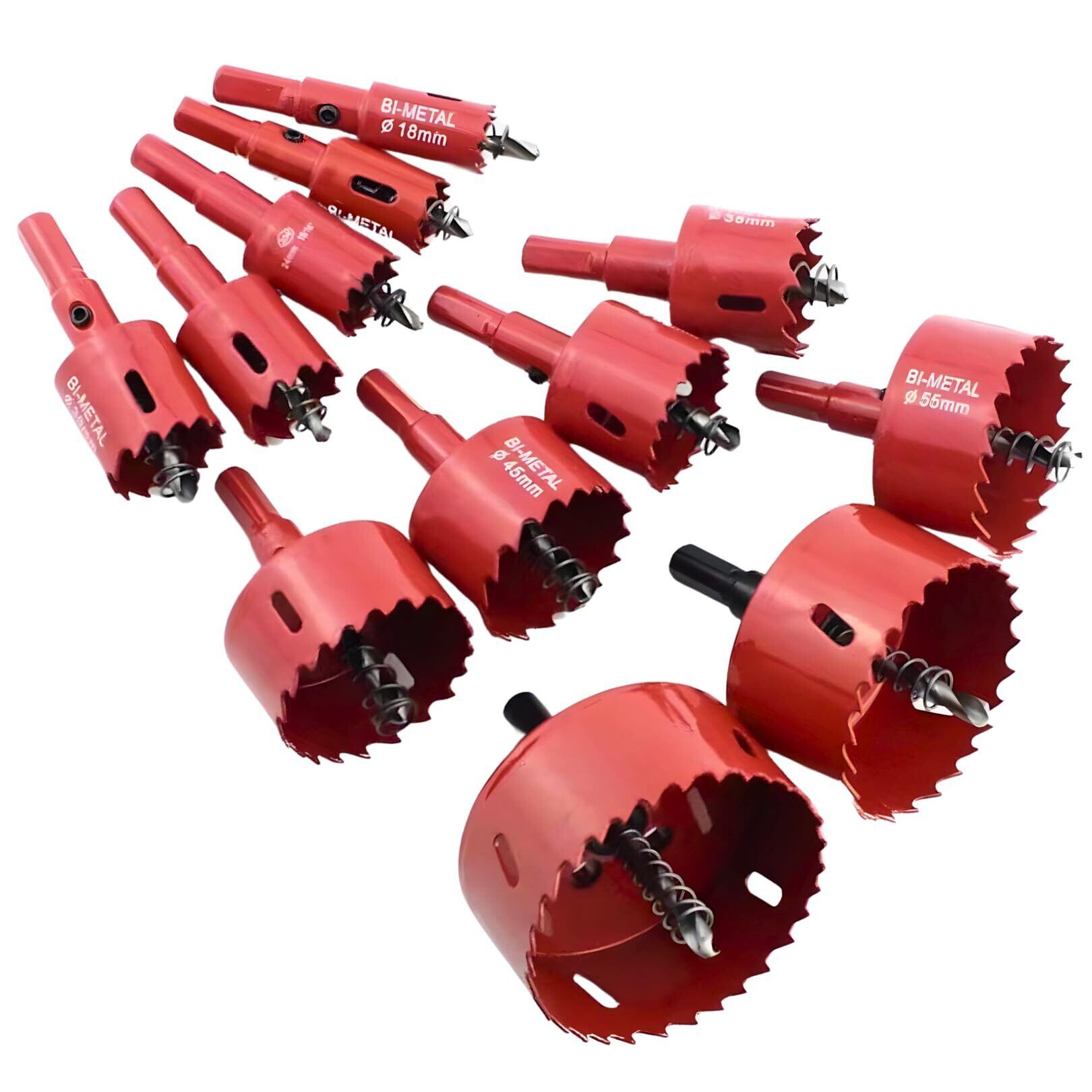 マキタ互換品 ホールソー 12本セット Φ 穴径 18㎜ 20㎜ 24㎜ 28㎜ 30㎜ 35㎜ 38㎜ 45㎜ 50㎜ 55㎜ 65㎜ 75 mm サイズ バイメタル製 HSS素材 薄刃設計 アルミ 鉄板 木材 塩ビ板 プラスチック 石膏ボード 対応 バネ付き スプリングセンタードリル付き お手入れ簡単 チャック径 軸径 10mm 電動ドリル ドリルドライバー