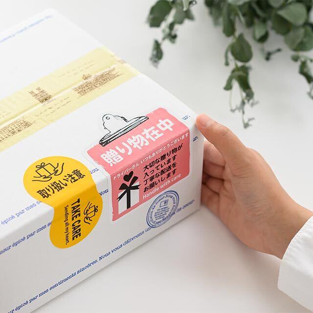 クリップのデザインがおしゃれな要冷蔵宅配シール。文字とイラストで注意を促します。中央部分にミシン目が入っているので、きれいに折って、段ボールの角に貼ることができます。