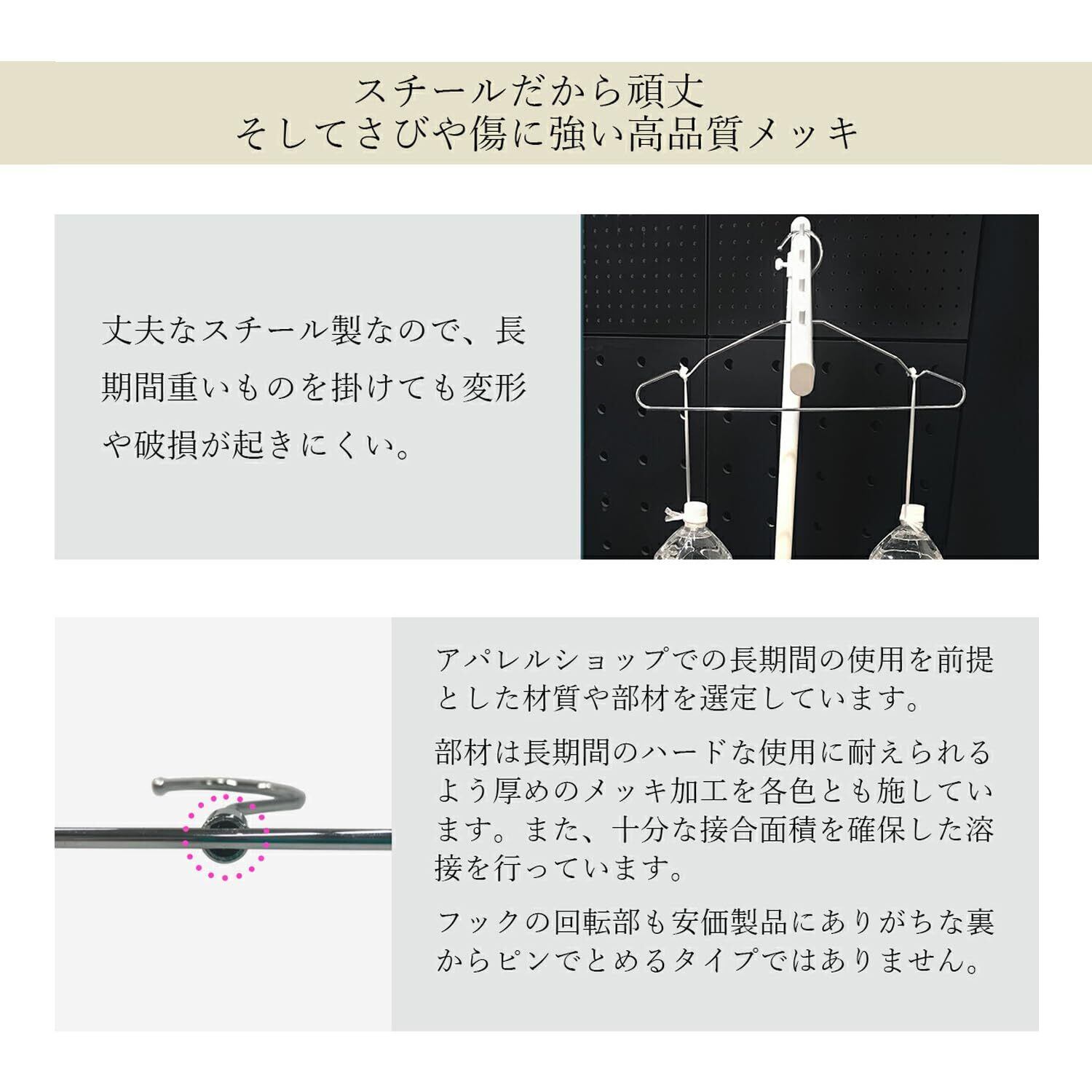 フックは便利な360度回転。ハンガーの両肩の凹みにはキャミソールやワンピース、ジーンズをかけられます。