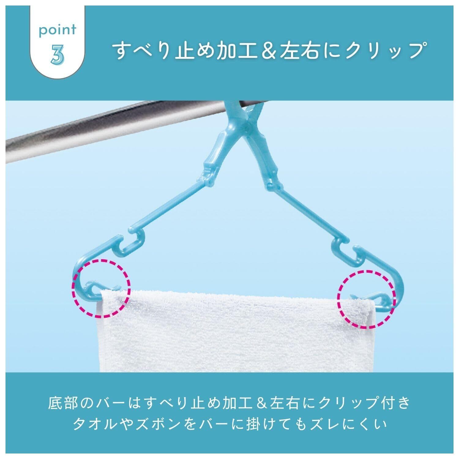 【便利なフックやすべり止め付き】アームに肩ひもホールがついているので、肩紐が細いキャミソールやタンクトップなども滑り落ちることなく干せます。スカートやボトムスなどを掛けられるフックも付いています。ハンガーの底部のバーは、すべり止め加工されているので、タオルやズボンをバーに掛けて干しても、ズレにくくなっています。