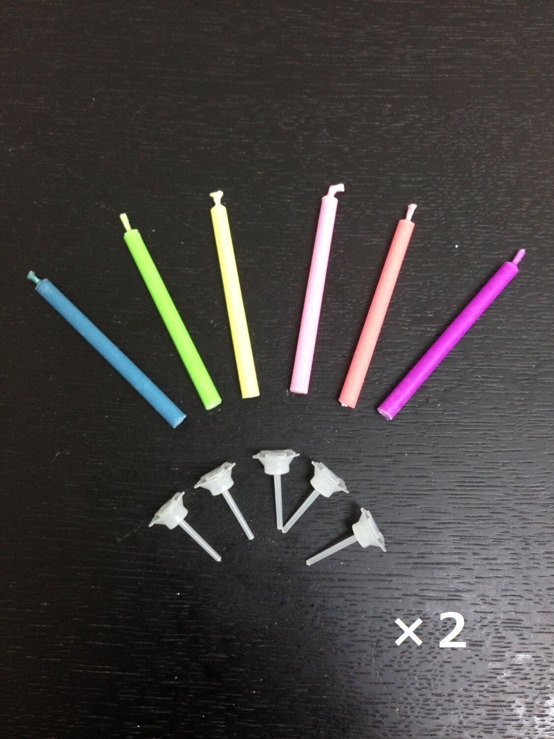 内容品:本体ピンク、青、赤、緑、黄色、紫×各2本ずつ(全12本)+ケーキに刺すピン付き(12本)。