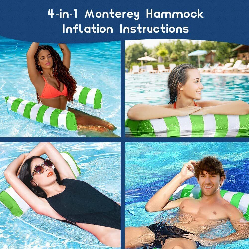 【4-IN-1デザイン、浮き輪ベッド】ハンモック、リクライニングチェア、フロートまたはサドルに変えられます。ハンモックで自由に四肢を広げることができ、もちろんプールでの娯楽やリラックスもできます。