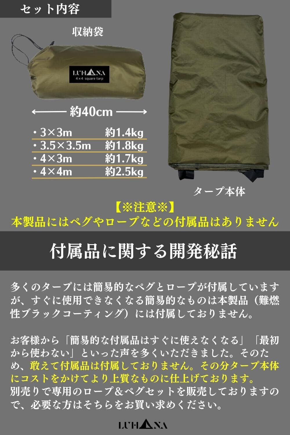 LUHANA タープ 正方形 スクエア 難燃性 ポリエステル 耐水圧8000mm ブラックコーティング シルバーコーティング ループ19個 軽量 4mx4m / 3.5mx3.5m / 3mx3m / 4mx3m (アーミーグリーン(難燃性ブラックコーティング ), 4mx4m)