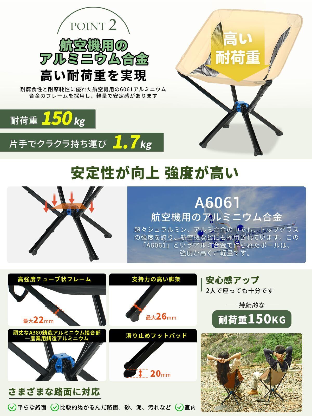 【高品質素材、最大耐荷重150kg】:この椅子は、600Dオックスフォード布素材を使用しており、丈夫さと耐久性をします。滑り止めの大型足カバーはさまざまな地面に簡単に適応できます。さらに、耐荷重を強化した設計で、最大150kgまで耐えることができます。