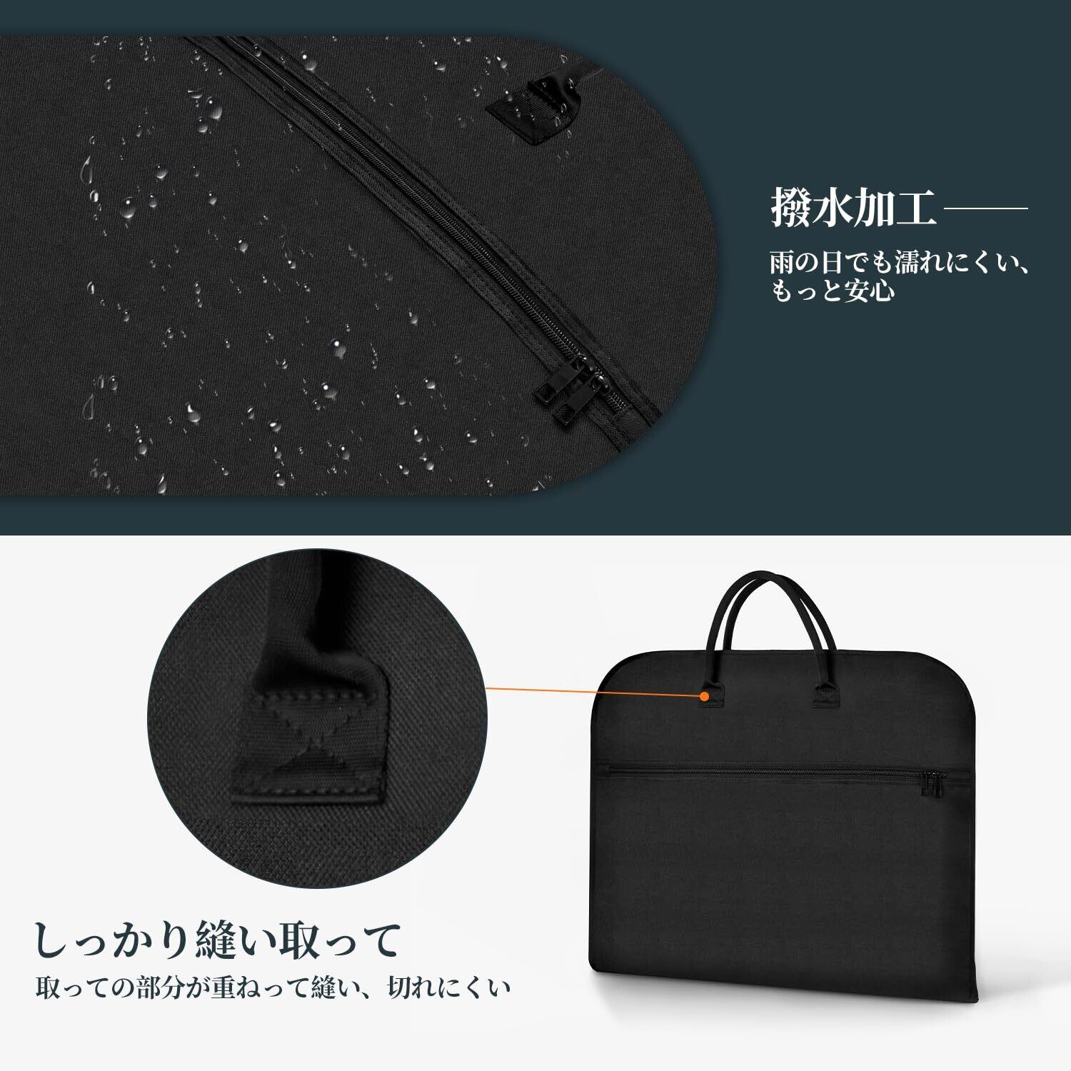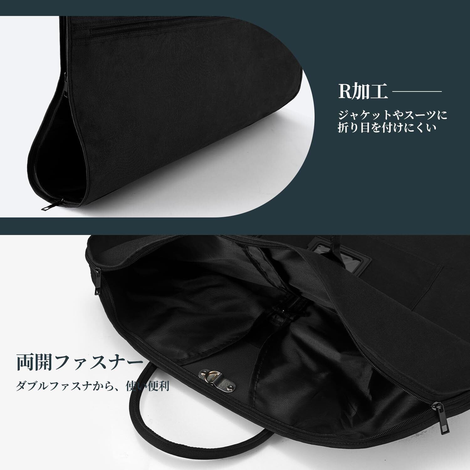 【洗練されたデザイン、高い機能性を実現】大切なスーツを守るために開発されたガーメントバッグだから、高強度の600dポリエステルを使用して耐久性と撥水性を確保。ハンドルの部分にも重ねて縫いて耐重性を保障まま、持ち運びに便利です。二つ折りのデザインとR加工でスーツだけではなく、長い服やドレスにもシワ付けにくく、収納できます。付属ハンガーも360°回転でき、便利なガーメントバッグです。