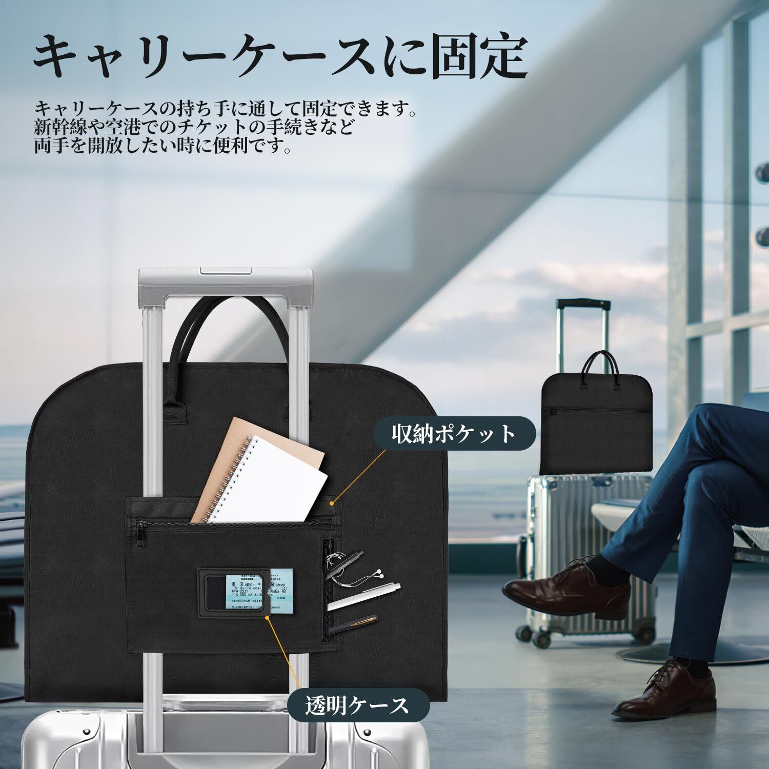 【革新!キャリーケースに通す事もできる!】スーツカバーの機能を更にアップ!背面のファスナー付きポケットがある事で、パスポートや小物をすぐに取り出すことができます。更にキャリーケースに通す事もできるので、新幹線や空港でのチケットの手続きなど乗り降りがスムーズになり、両手を開けたいときに非常に便利です。
