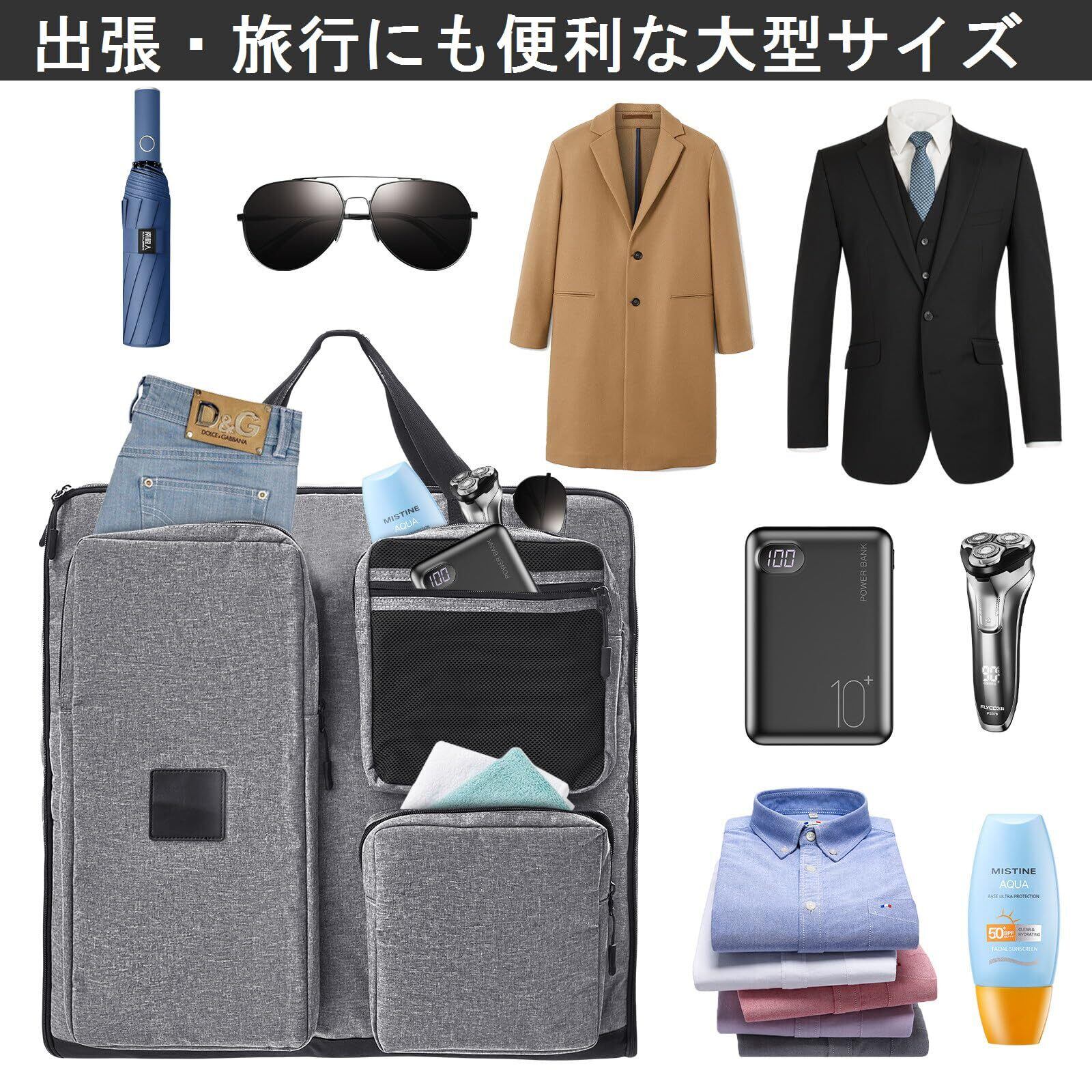 【スーツ一式をまとめて収納】ビジネスマンであればキレイなスーツを着るのが常識。只、簡易なガーメントバッグだと持ち運びの際にシワが付いてしまうことも。この悩みを解決するのがこのガーメントバッグ。持ち運ぶ際にスーツがズレてシワにならないよう考えられた設計。スーツ、シャツ、ネクタイ、ベルト、靴下、ハンカチなど、出張時に必要なものをまとめて収納できるガーメントバッグ。スーツはハンガーに掛けたまま収納できるのでシワにならずに持ち運べます。
