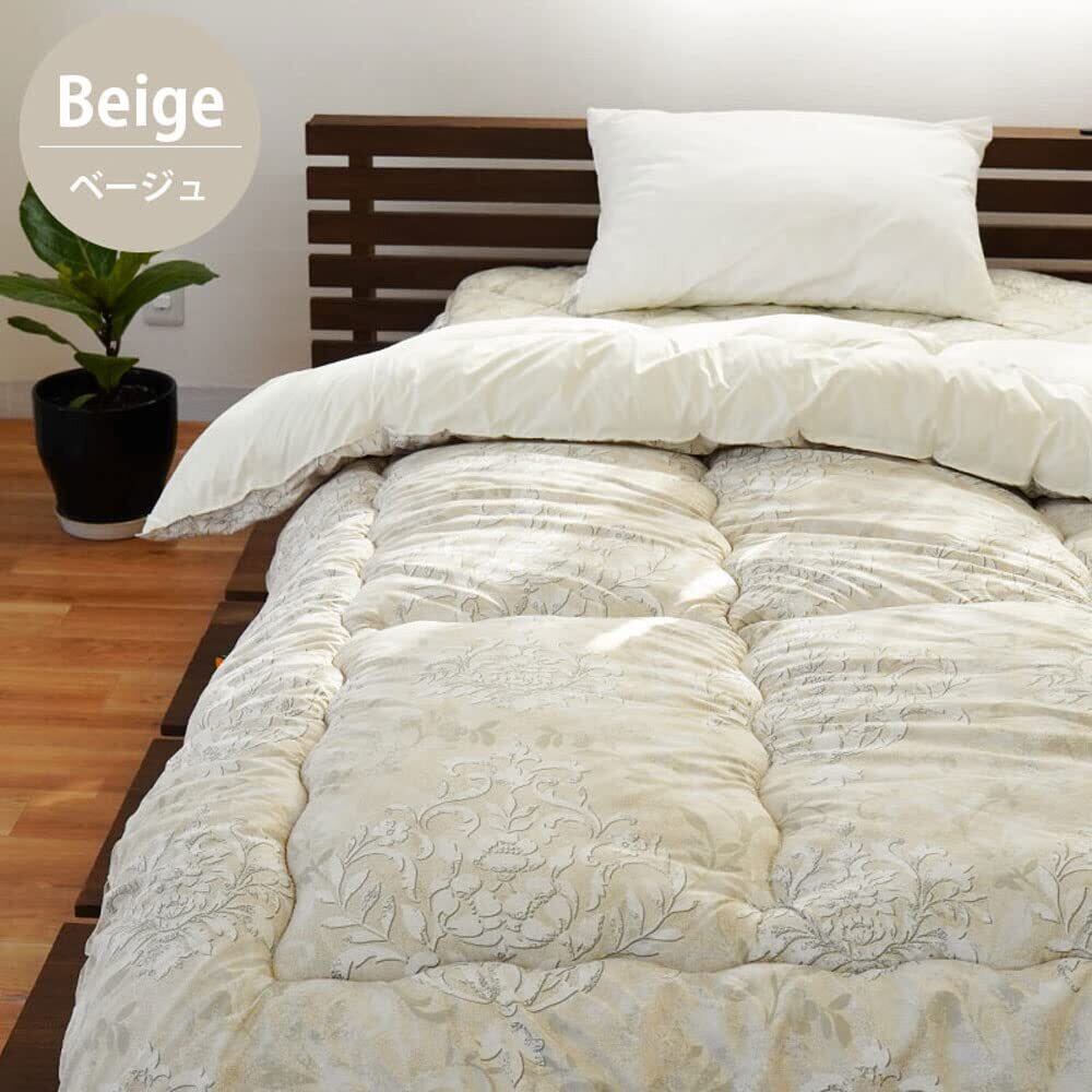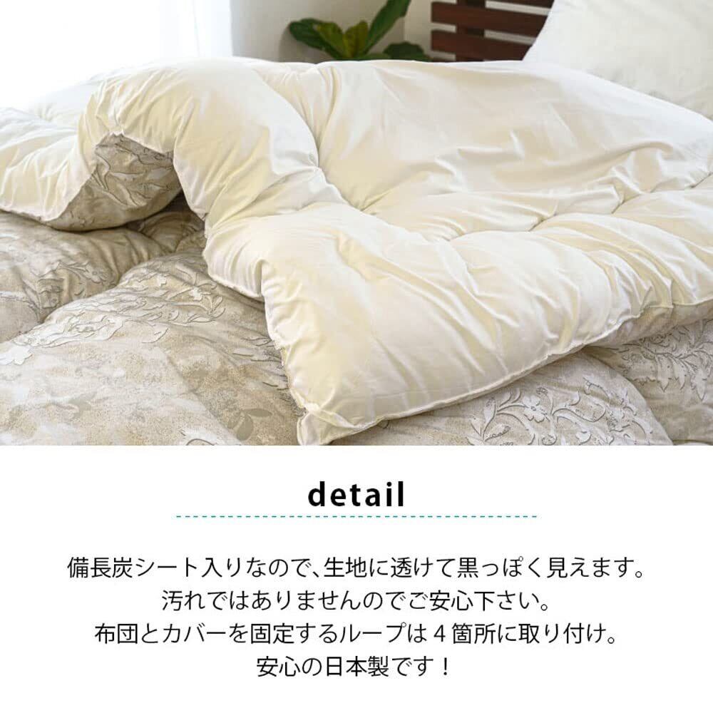 天然の獣毛素材・ウール(羊毛)を使用した国産掛け布団。中わたにはフランス産ウールを50%使用。ふとん用に適したリモージュ地区で採れるウールは、優れた保温性・弾力性を兼ね備えています。ウールは湿気を与えると自然に熱を出す発熱性があり、じんわりと温か。それでいて吸湿・発散性にも優れ、不快なムレ感を解消してくれます。中わたにはウールのほかに帝人の防ダニ抗菌防臭素材マイティトップII(R) ECOを使用。さらに、防ダニ・防カビ・抗菌・消臭・調湿効果のある紀州備長炭使用のシート入り!備長炭が持つ遠赤外線効果で冬は暖か、夏は涼しくお使いいただけます。表地は上品なオーナメント柄デザイン、裏は無地。安心の日本製!ものづくりの国・日本で作られたお布団です。