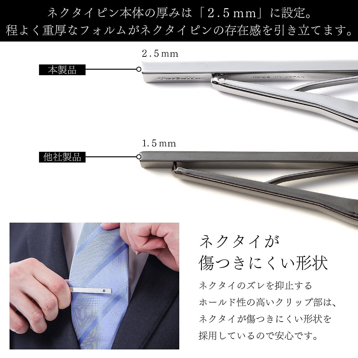 【加工】表面にはマットな輝きが美しい「サテーナ加工」、サイド面には艶やかな「鏡面加工」が施され、見る角度や光の加減によって美しい光沢の調和を感じられます。ネクタイのズレを抑止するホールド性の高いクリップ部は、ネクタイが傷つきにくい形状を採用しているので安心です。