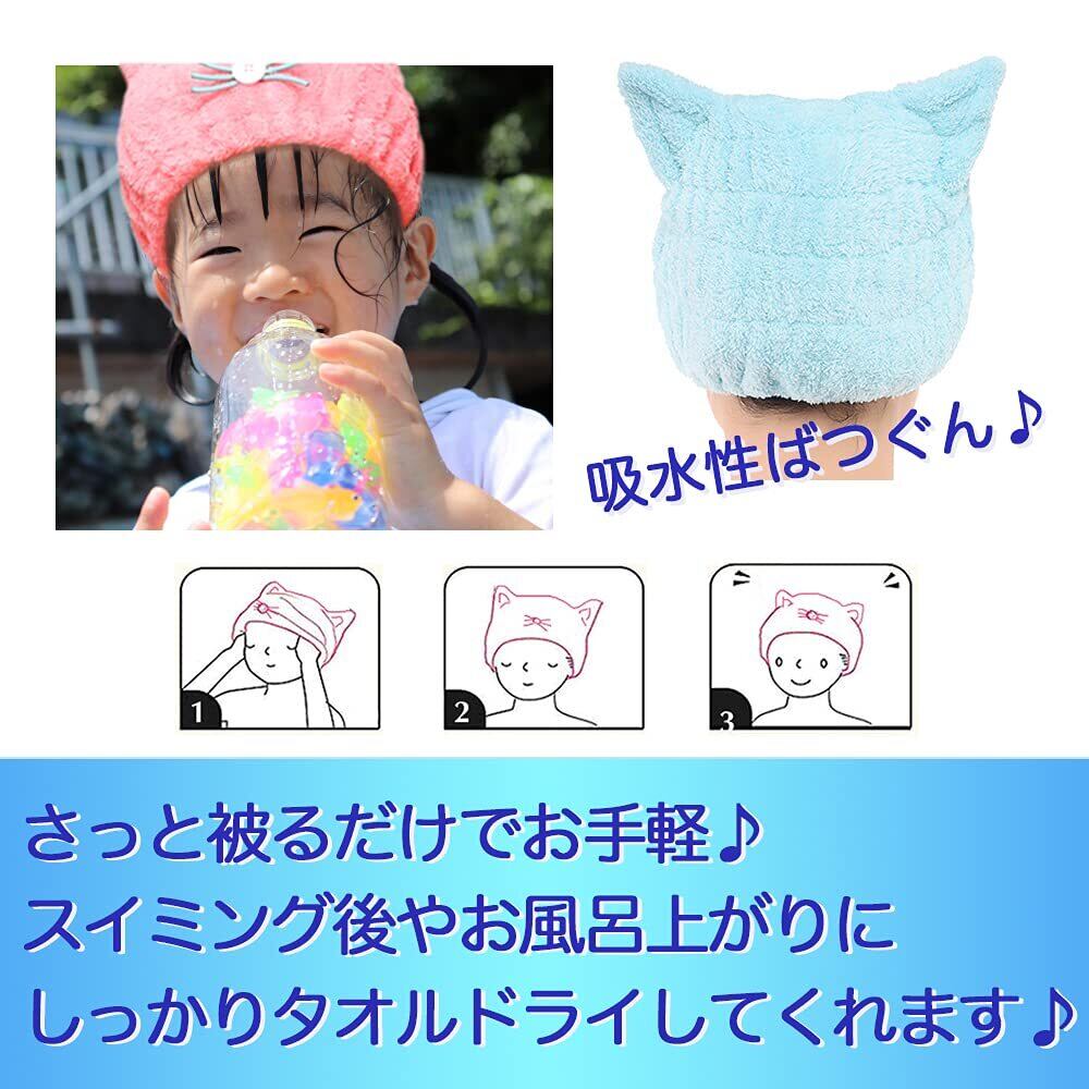 shttown 子供 タオルキャップ 被るだけ 簡単ドライ 速乾 可愛い ネコ ドライキャップ お風呂 プール キッズ (ブルー)