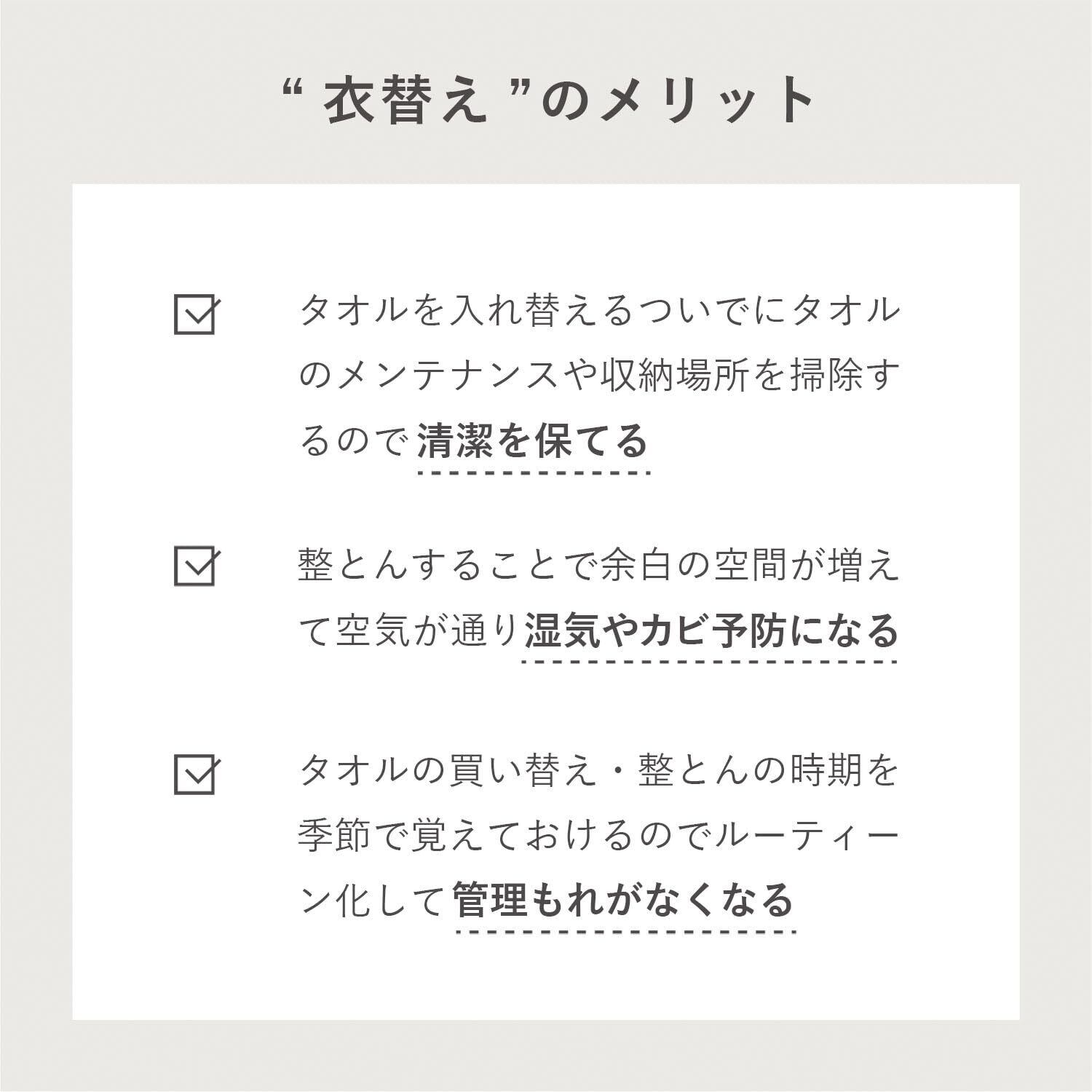 【厚みの違う2種類のタオル】春夏タイプと秋冬タイプ、厚みの違う2種類のタイプをご用意。パイルの長さを変えることで、それぞれの季節に合ったタオルを試行錯誤の末、完成させました。 季節によって衣類の衣替えや動物の毛の生え代わりがあるように、タオルも衣替え、始めませんか?