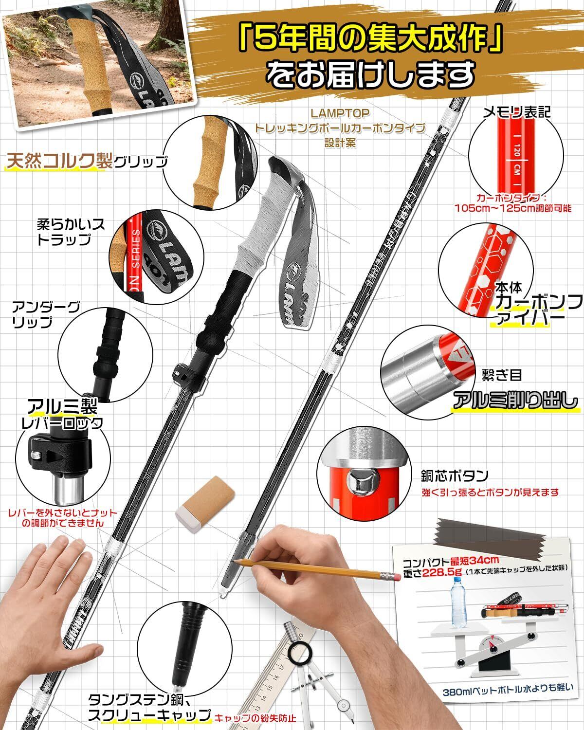 LAMPTOP トレッキングポール カーボン 2本セット アルミ製 コルクグリップ 登山ストック 折りたたみ式 軽量 アルミ 228g 【日本語取扱説明書付】 コンパクト ウォーキングポール 収納ケース&付属品付き 105~125cm調節可能