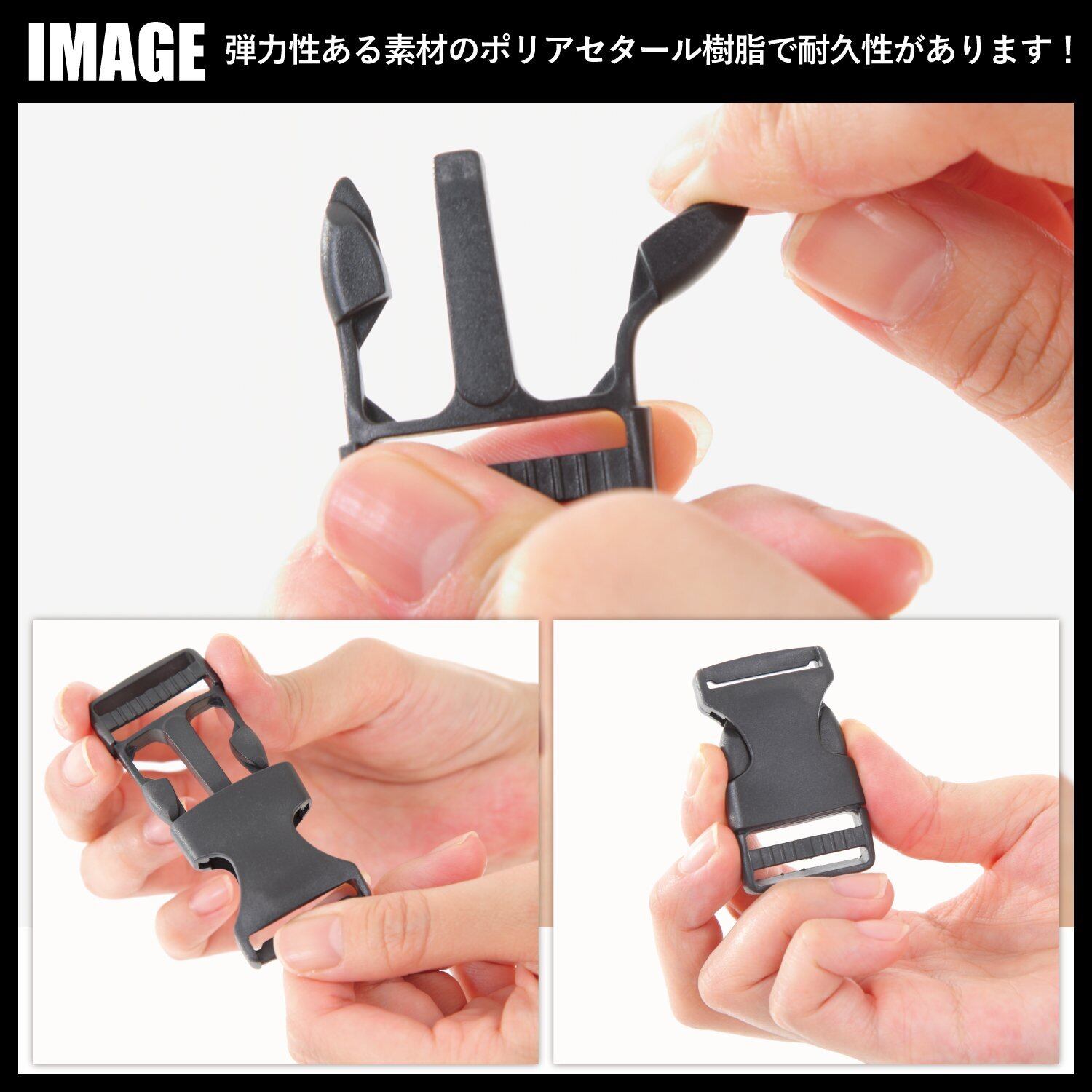 【素材】 ポリアセタール樹脂(pom) 弾力性、耐久性があり交換、リペアに安心な サイドリリースバックル