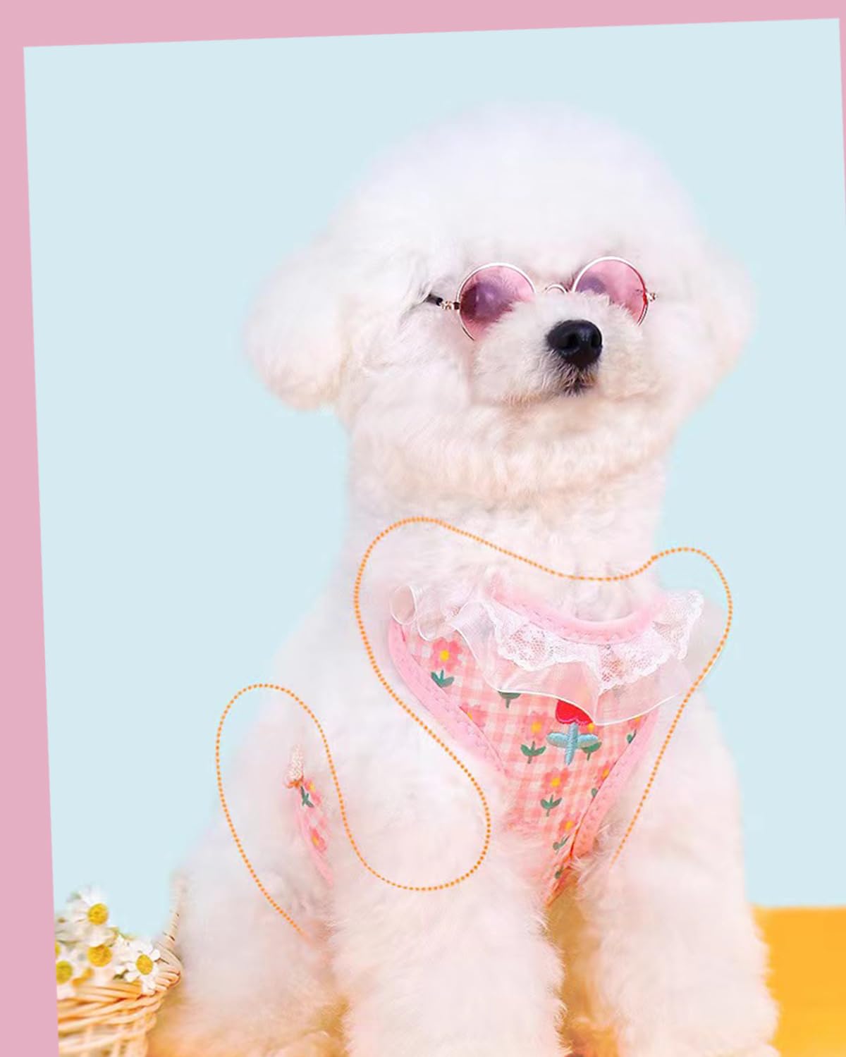 花とレースのデザインで優しい癒し感、四季対応の通気性: おしゃれで実用的なデザインで、花とレースのディテールが優雅な雰囲気を醸し出し、四季折々の気候に対応する通気性を提供します。日常の散歩からアウトドアアクティビティまで、ペットとの信頼感とおしゃれなスタイルを演出します。
