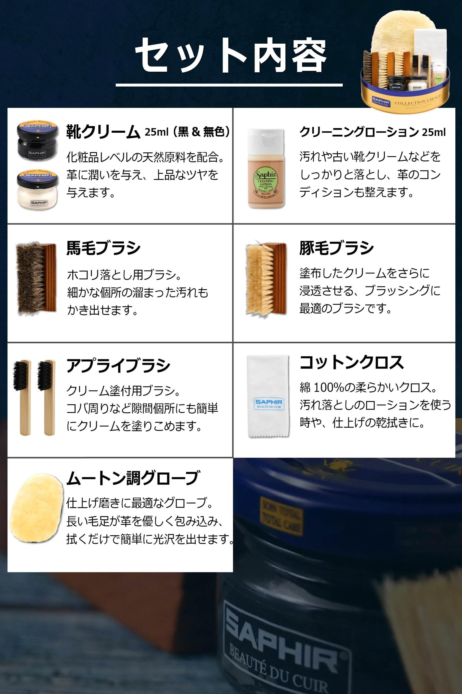 [サフィール] 靴クリーム シューケア スターターセット ダブル(PA-SASZG) 靴磨きセット 革靴 手入れ セット 簡単 初心者 クリーナー ブラシ 馬毛 豚毛 クロス 黒 無色