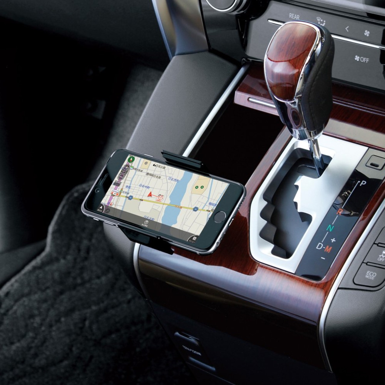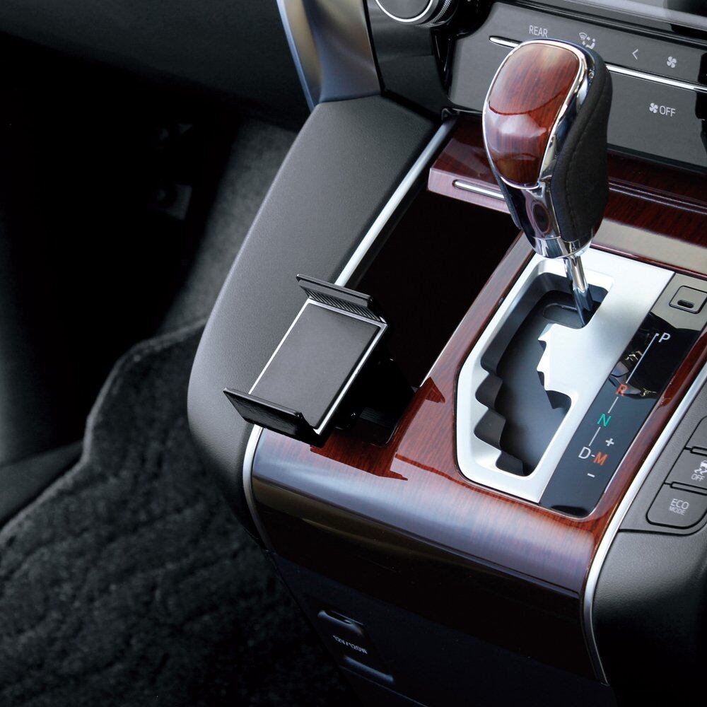 専用設計で内装にピッタリフィットします。 約55mm~90mm幅のスマートフォンに対応。 本製品収納後、車両のセンターアッパーボックスのフタを閉める事も可能です。 取り付けには両面テープは使用せず、センターアッパーボックス内に本製品を入れ、ロックパーツを動かして固定。