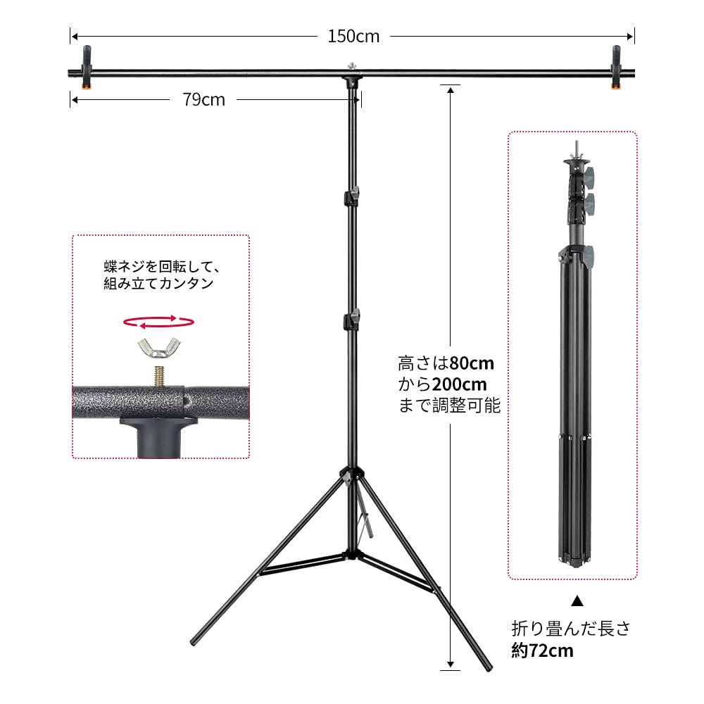 【プロなT字型背景スタンド】背景スタンドは艶消しスチール材質、頑丈で耐久性があり、傷付けやすくないです。ライトスタンドの高さは80cmから200cmまで調整可能です。