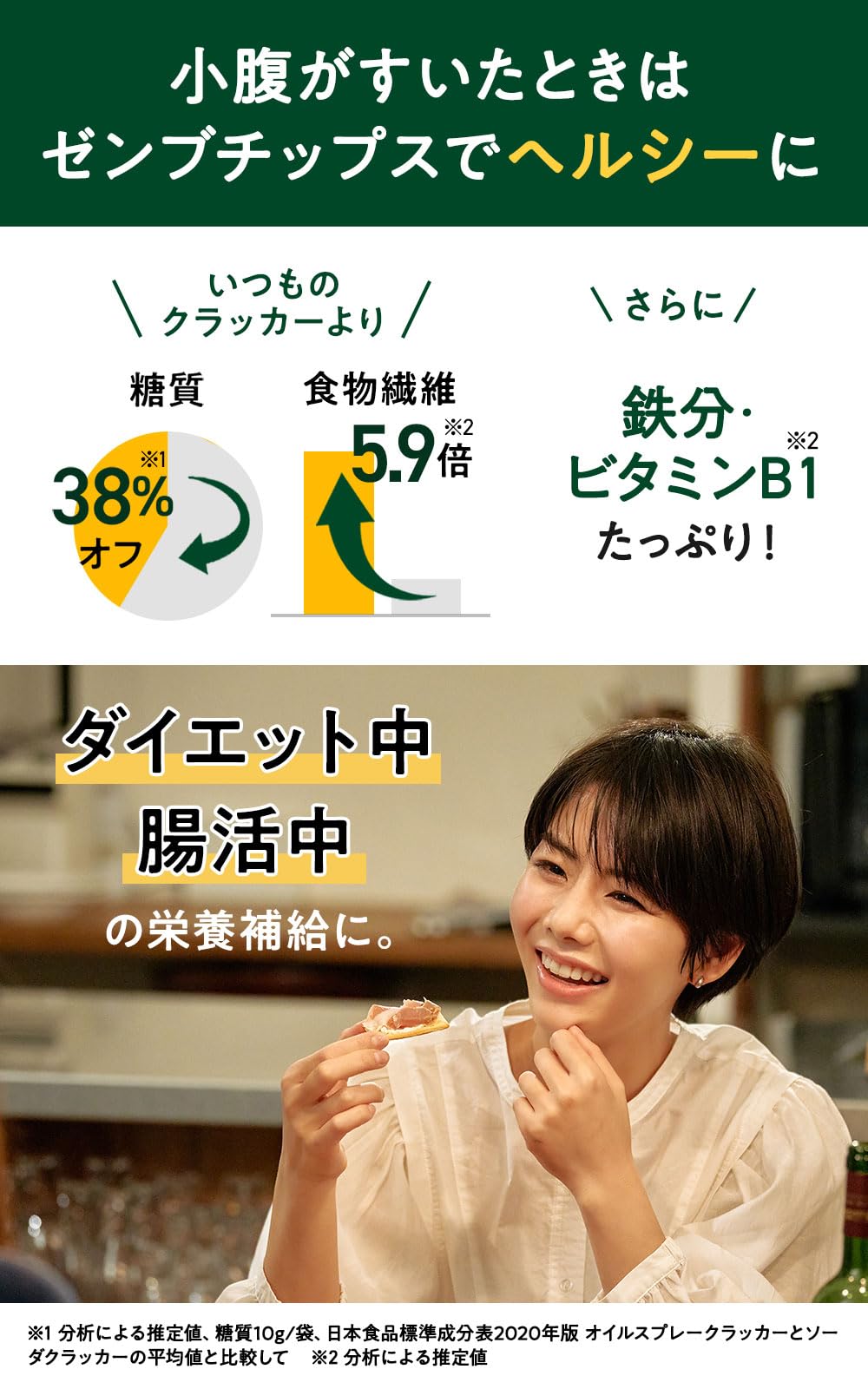 栄養成分: ゼンブチップス(1食1袋(24g)中):エネルギー 115kcal、たんぱく質 3.7g、脂質 6.0g、 糖質 10.0g、食物繊維 3.0g、食塩相当量 0.2g