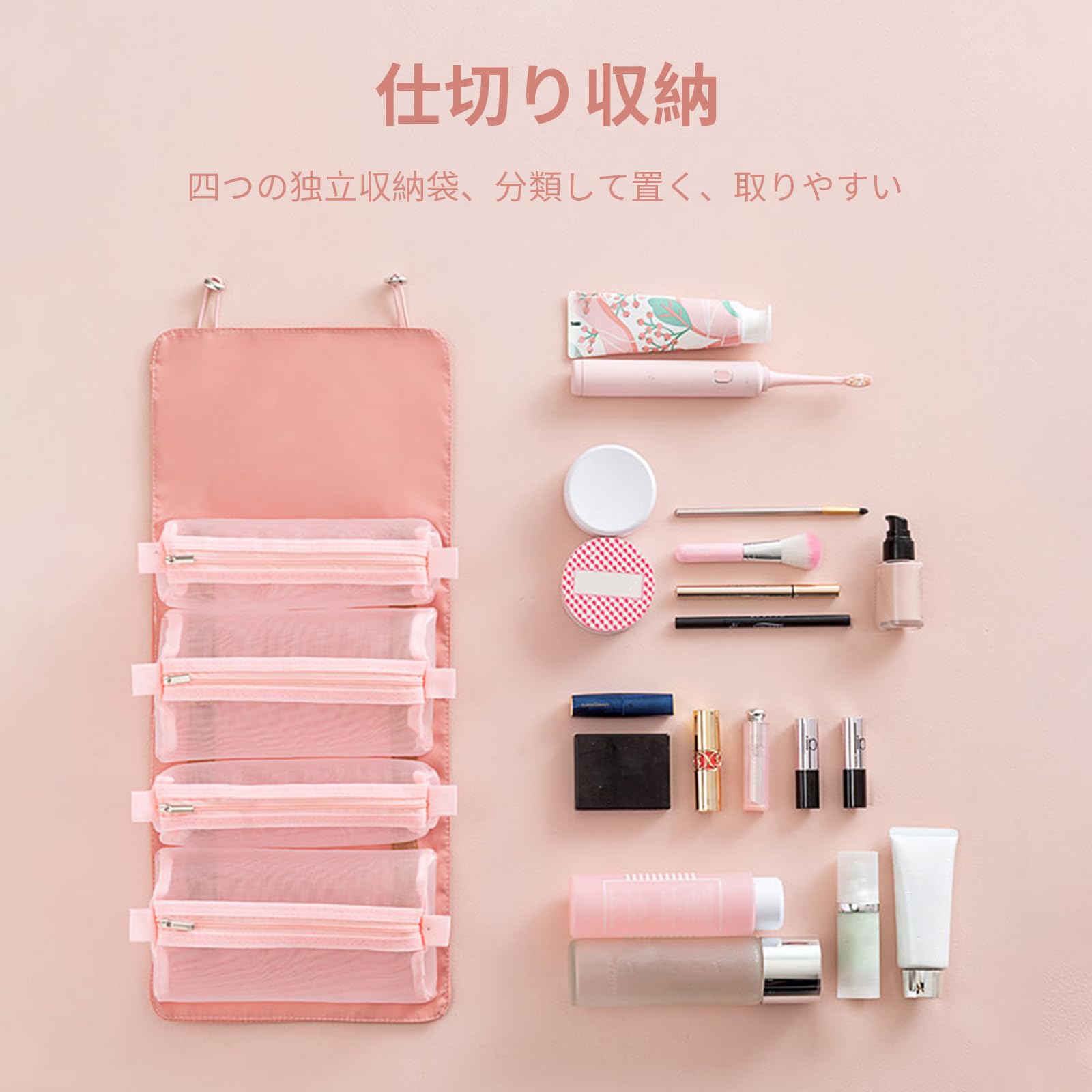 【新春セール】ALLMIRA メイクポーチ トラベルポーチ 化粧ポーチ 大容量 4仕切り 旅行 防水 コスメポーチ 洗面用具 ポーチ 旅行用 持ち運び 折り畳み トラベル 取り外し 折りたたみ 多機能 バスルームポーチ トイレタリーバッグ 吊り下げ バニティーポーチ 化粧品入れ トイレタリーバ 小物入れ 収納バッグ メンズ レディース (ピンク) | わくわくSHOP