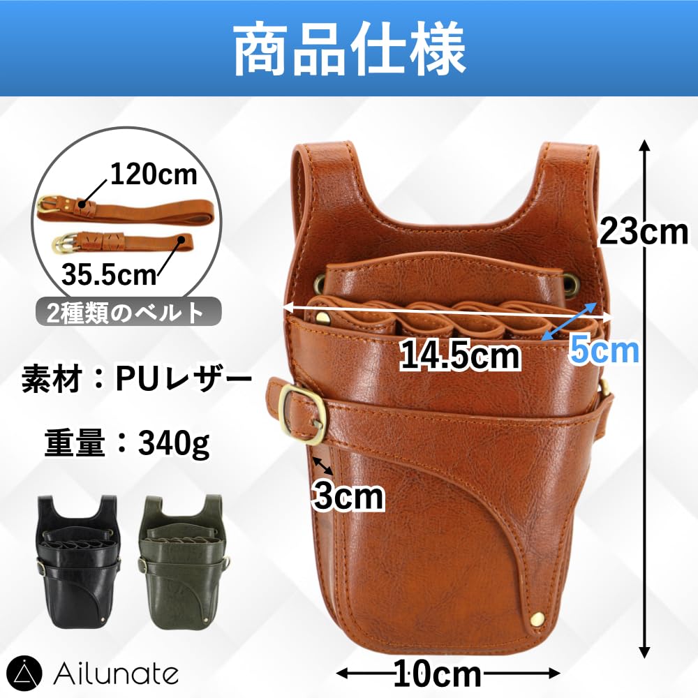 Ailunate シザーケース 美容師 トリマー 本革 レザー シザーバッグ 革 花屋 5丁 肩掛け 腰掛け ベルト付き