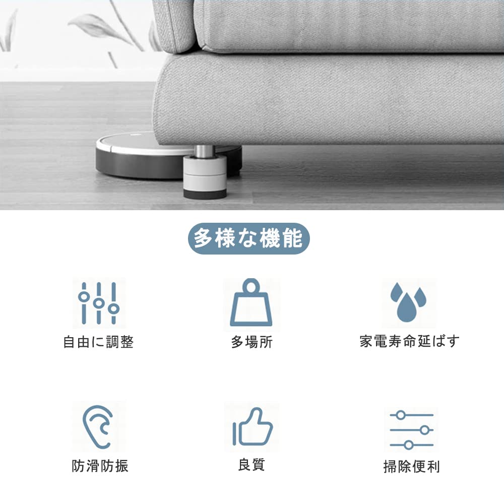 【商品特徴】取り付け作業は置くだけで実に簡単です。重ねて使用可能、耐摩擦、滑り止め、洗濯機からの振動の伝達を軽減します。