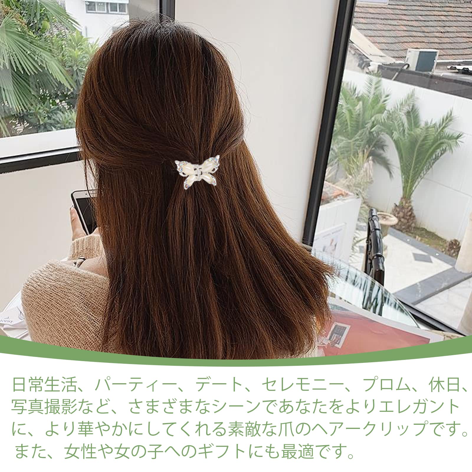 【ミニヘアクリップ】ミニサイズの蝶型ヘアクリップです。クリップにキラキラしているラインストーンが飾って、パールの翼はほんとに美しい。子供にも大人にもおすすめ!