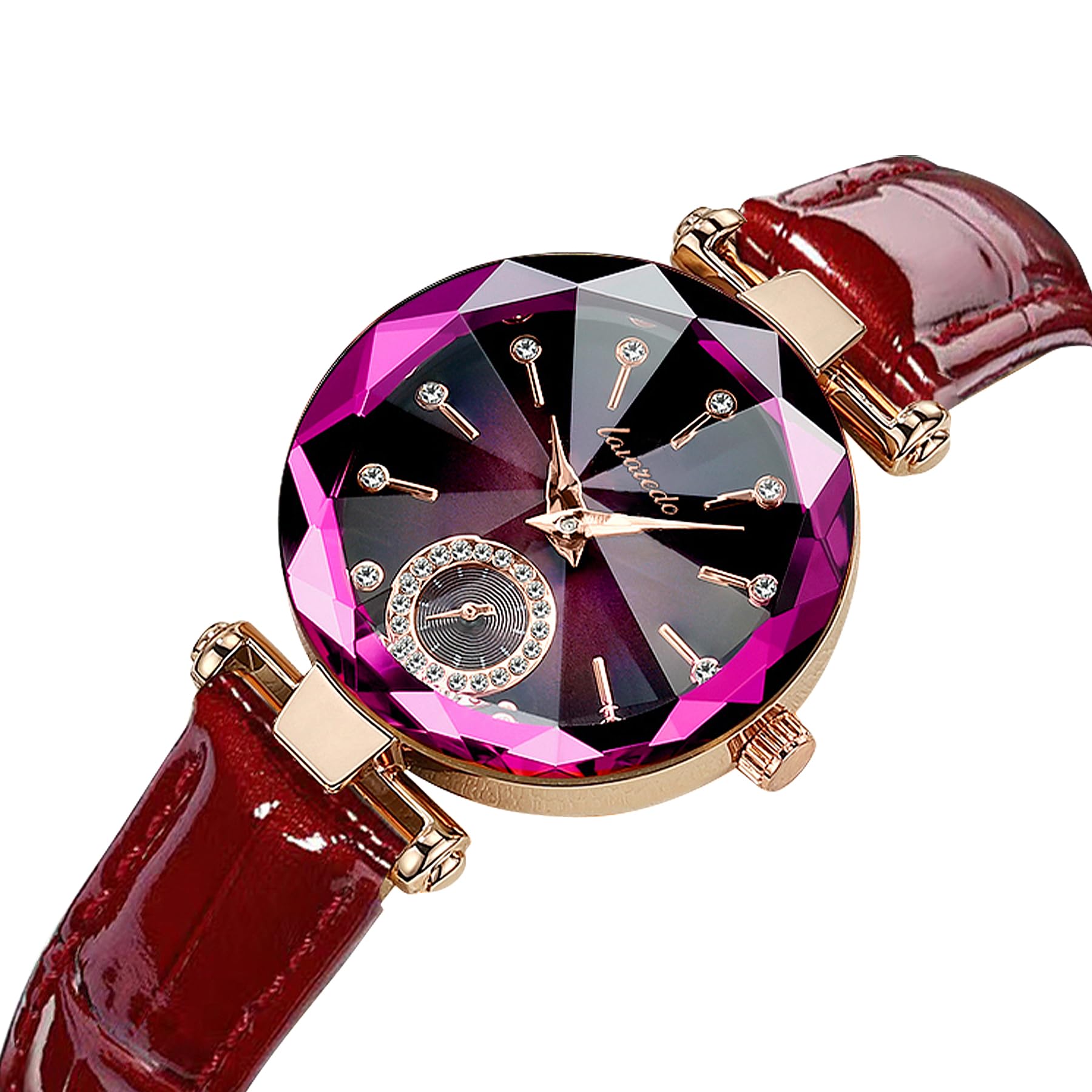 「アナログ表示腕時計」:2針表示(時針と分針)+秒数表示、正確な時間が読めます。華やかなカットガラス文字盤と高級なレザーベルト、女性に人気の時計です。かわいいサイズは腕がより細く見えます。