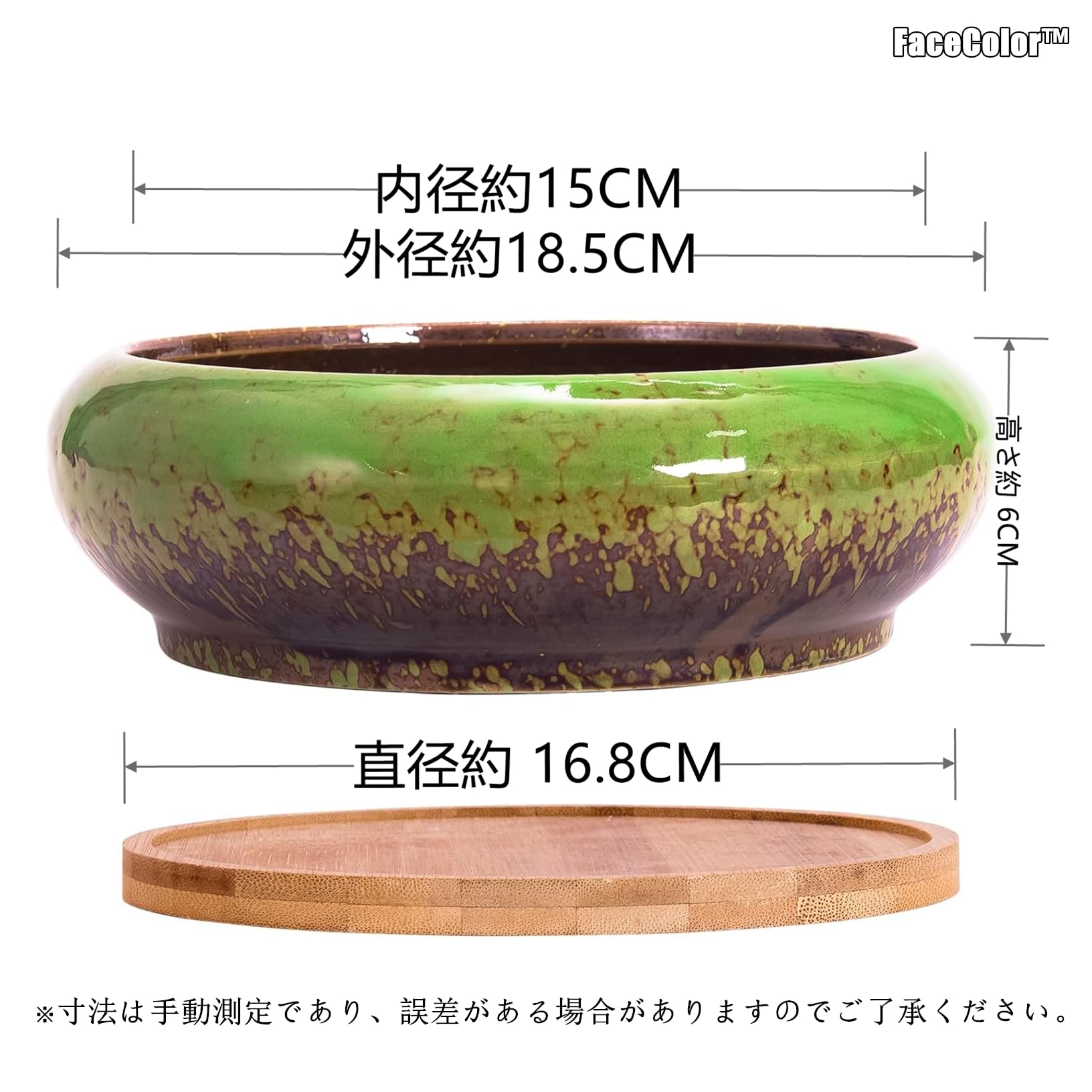 Facecolor 多肉植物鉢 盆栽鉢 釉掛け モダンな盆栽ポット おしゃれ和風陶器植木鉢 釉薬プランター サボテン鉢 円形 外径18.5CM 内径15CM 高さ6CM 底穴あり 受け皿付き 鉢底ネット付き 浅い 盆栽 プランター 屋内および屋外での使用 飾り 寄せ植え・肉植物・観葉植物対応 (植物なし) (グリーン)