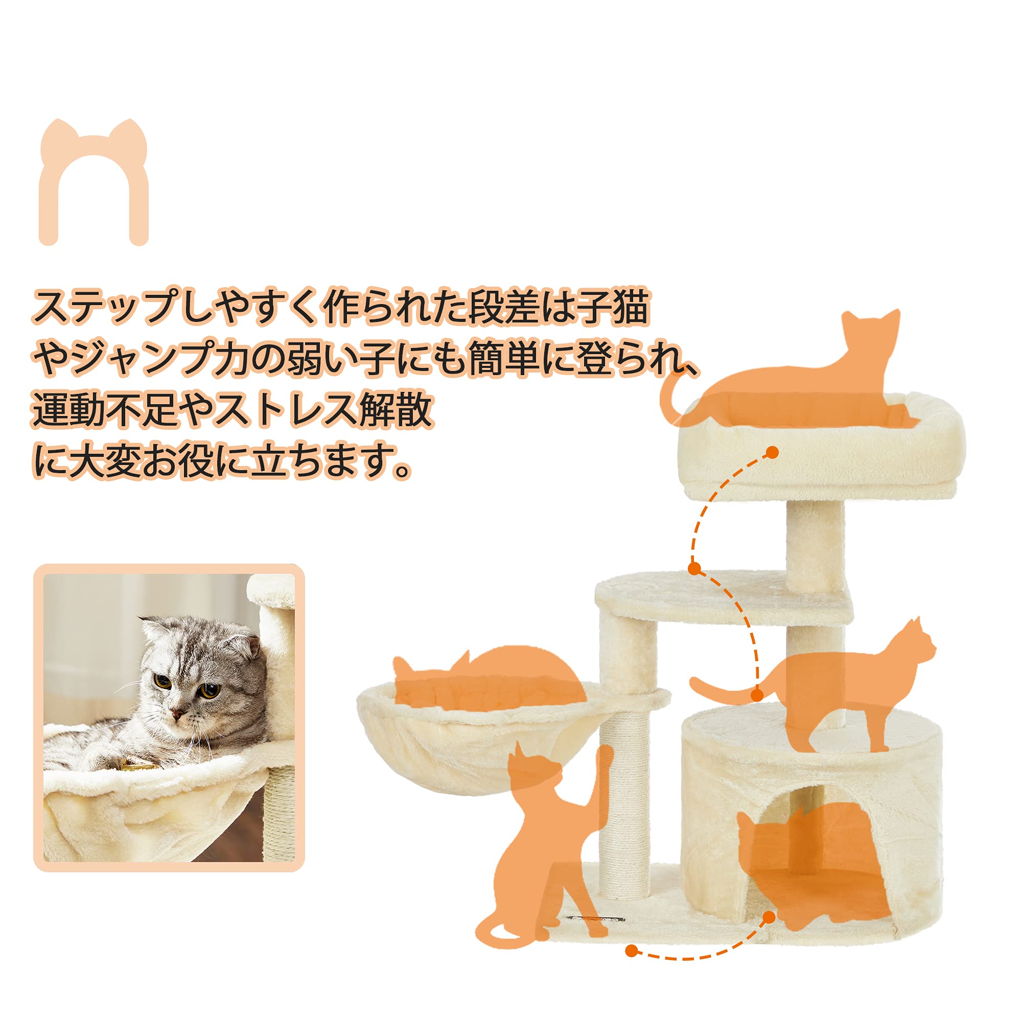 【初めのタワーにピッタリ】ステップしやすく作られた段差は子猫やジャンプ力の弱い子にも簡単に登られ、運動不足やストレス解散に大変お役に立ちます。且つ支柱は全面麻紐で、思う存分ガリガリできます