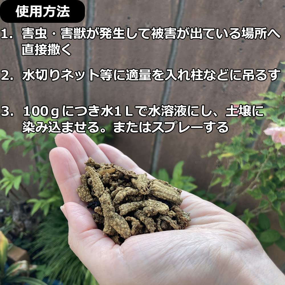 使用方法:害虫、害獣が発生して被害が出ている場所へ直接置く。水切りネット等に適量を入れ柱などにつるす。「ヒトデ浪漫」100gにつき水1Lで水溶液にし、土壌にしみこませる。またはスプレーする。
